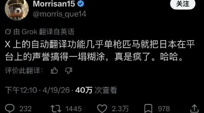 2026年3月底,马斯克对X平台的推荐算法和自动翻译功能做了重大升级。这本是一次技术层面的更新,却意外引发了一场国际舆论风暴。长期以来,日本右翼在本土社交圈用日语美化二战历史,掩盖侵略事实,外界苦于语言障碍,很难窥探其中真相。日语使用群体相对狭窄,这种“信息孤岛”让右翼叙事得以蔓延,甚至影响部分年轻一代的历史观。