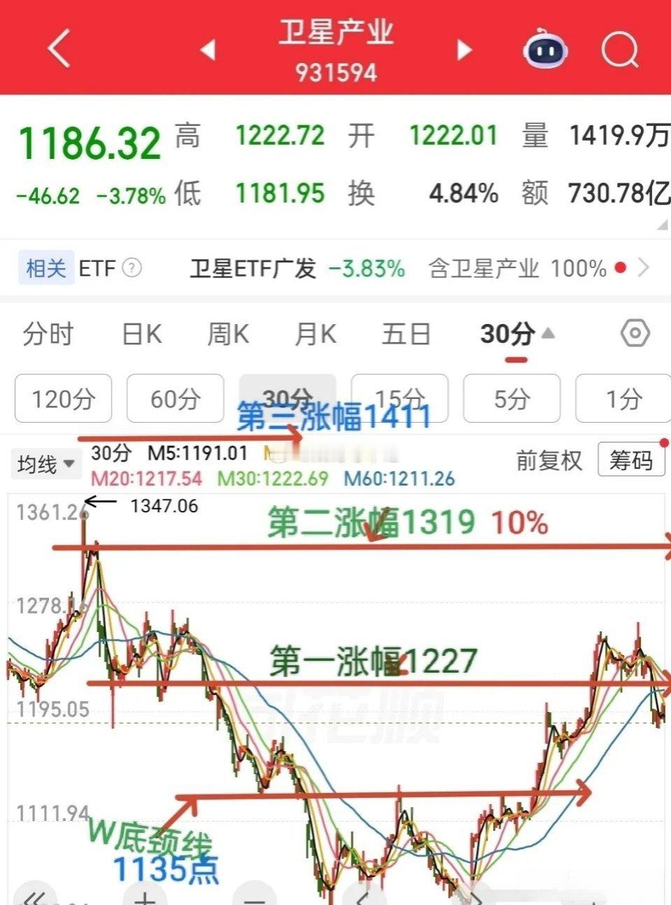 卫星产业,能否接力CPO成为市场下一条核心主线?此前卫星产业板块历经两周反弹行情,在前期关键压力位受阻承压回落。结合日线形态来看,板块下周大概率延续回踩调整走势,预计整体回调幅度约3.5%,调整至20日均线关键支撑位后,有望止跌企稳,该区间是优质低吸加仓节点。切换至周线维度分析,当前卫星产业已稳稳站上5周、10周、20周均线,多条中长期均线同步保持上行态势,周线级别上涨趋势明确且稳固。短期日线层面的技术性回调,只是上涨途中的正常洗盘,并不会改变板块中线上行的格局。再结合30分钟级别走势推演后续上涨空间:板块30分钟K线构筑标准W双底结构,前期反弹有效突破颈线压力,顺利完成第一阶段上涨目标,阶段性反弹幅度超10%。现阶段属于冲高后的获利盘回踩修复,待调整充分、企稳蓄力后,大概率开启第二轮上攻行情。后续目标位看1319点,相较于周五收盘点位,仍有近10%的上行空间。对于近期高位进场被套的投资者而言,后续反弹行情有望实现解套,甚至博取超额收益。以上走势推演,均基于成熟技术形态与实战经验综合判断,股市有风险投资需谨慎