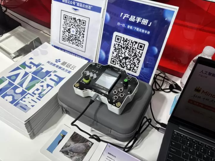 现场展示了人工智能课程案例——校园生物识别助手:该案例使用行空板M10实验盒现场演示鸟类识别模型的完整训练过程。观众可以直观看到:随着训练轮次增加,模型识别准确率逐步提升、损失值不断下降,最终生成可用的模型文件,并实时识别鸟类图像。案例完整呈现了从模型训练到实际应用的AI工作流程,适用于初中阶段的人工智能课程教学展示。