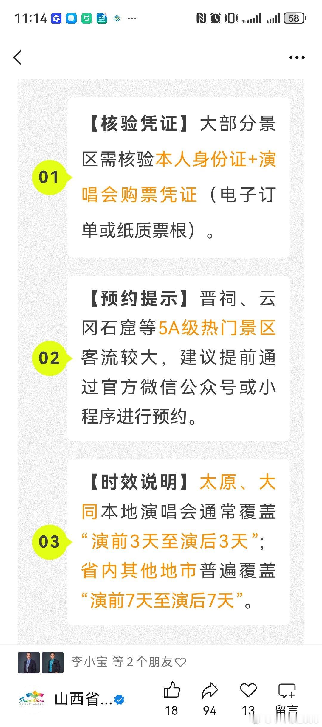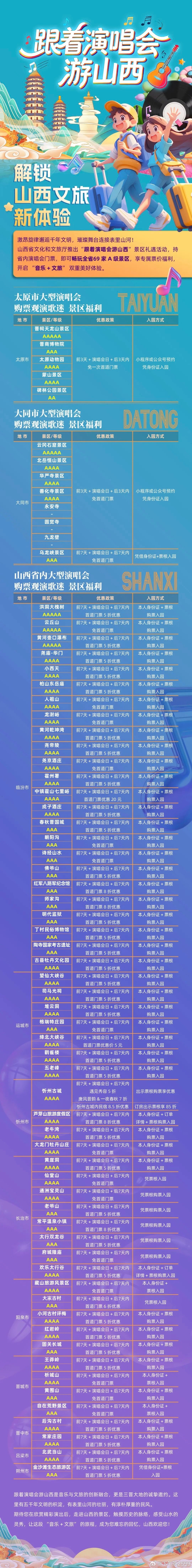 表里山河,晋善晋美来山西,赴一场盛大演唱会,览五千年华夏风华!歌迷之城 太原宠你、大同等省内各大热门演唱会举办期间,只要手持演唱会观演票根,演出日前后3——7天即可解锁全省超多专属礼遇!数十家 A 级景区门票减免优惠、星级酒店专属暖心住宿福利一站式畅享,一票玩转古韵三晋。