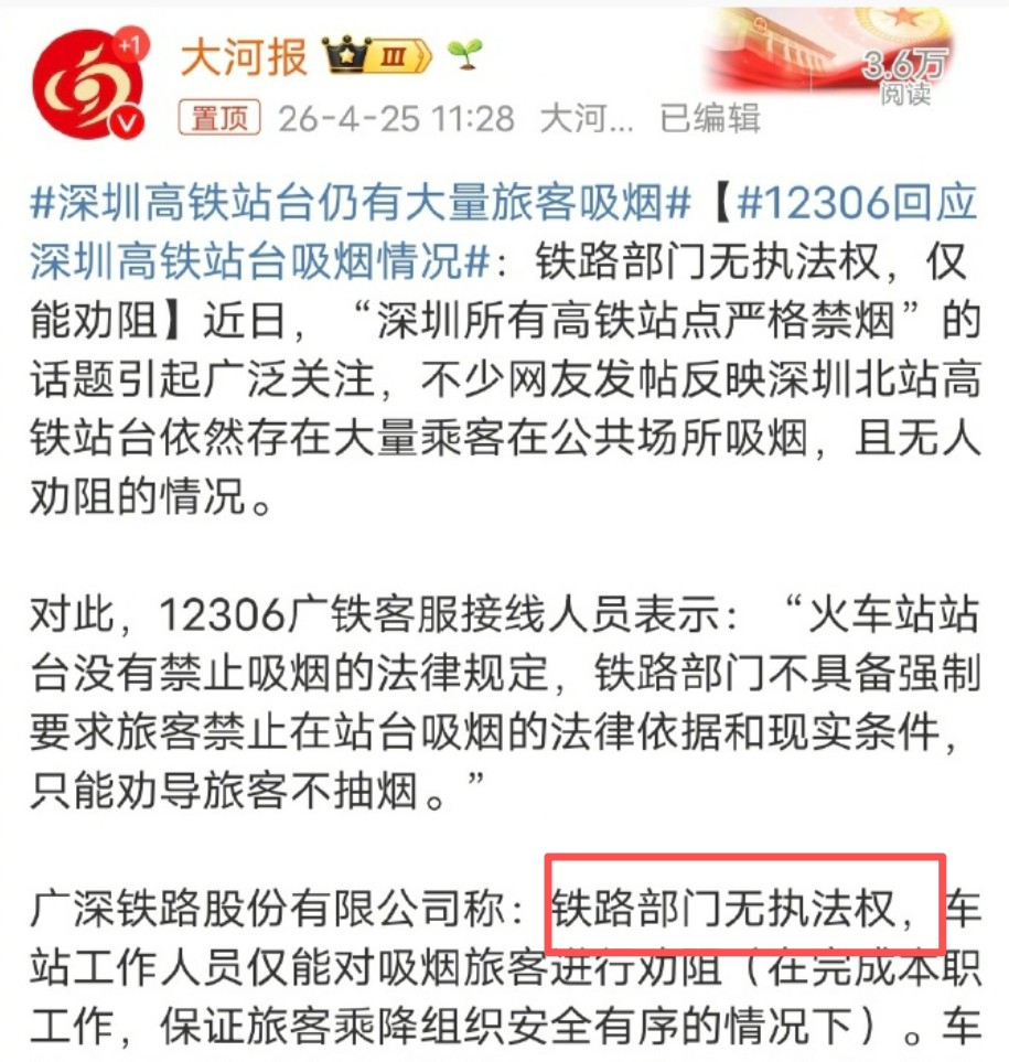 现在的问题是,面对破坏社会秩序的行为,许多人存在过分的双重标准,打脸不断,不实事求是,而是从狭隘情绪出发,简单以身份来站队,试图以舆论声量引导最终裁决,所以许多本可以严肃讨论的议题,最后都因回旋镖太多,成了魔幻对轰的乐子剧场。深圳 吸烟深圳违规吸烟举报方法12306回应深圳高铁站台吸烟情况