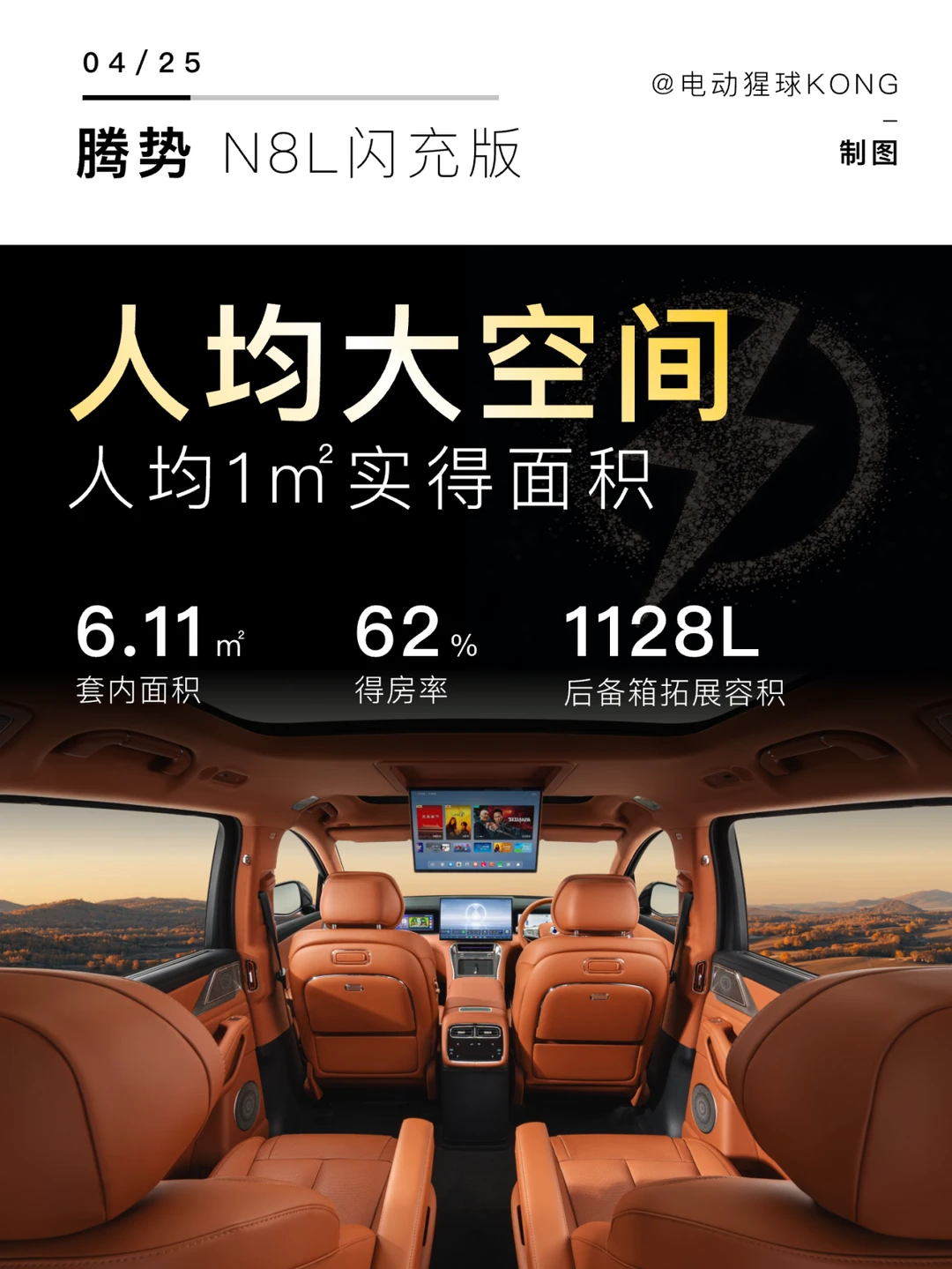 空间只看长宽高那是外行。腾势N8L套内面积6.11平,得房率62%,真正做到了人均1平米,前排座椅一键切换1.8米的大床,49处储物空间和最大1128升的可拓展后备箱。家人露营时,它能秒变温馨的移动起居室