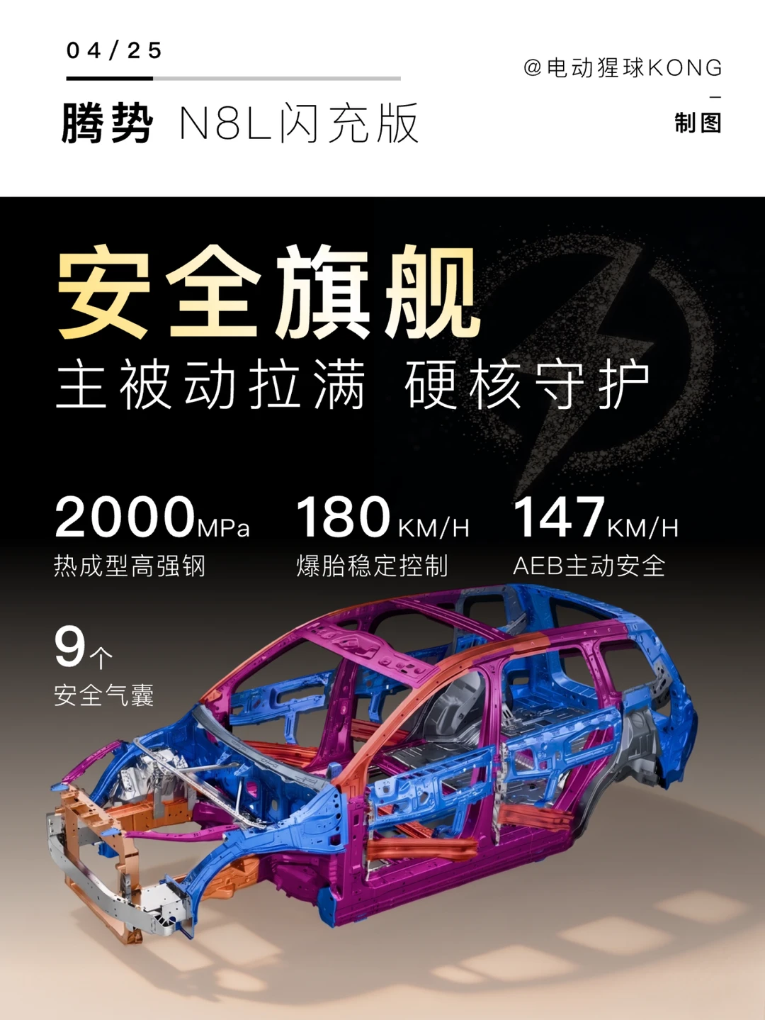 很多车谈安全只说气囊,腾势N8L敢谈易三方赋能的高速爆胎稳定控制。高强度热成型钢笼式车身,关键处2000兆帕热成型钢,单侧顶压超高载荷14.3吨。配合第二代刀片电池的安全性,这才是全家出行该有的底气