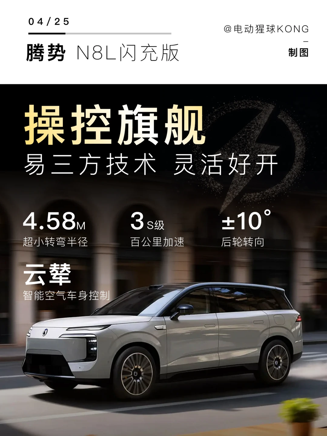 都说六座SUV开起来像开船,腾势N8L最小转弯半径仅为4.58米。窄路掉头或市区泊车时,跟小车一样灵活。易三方技术,三电机独立驱动配合后轮双电机独立转向,最大转向角度正负10度。不仅仅是好开,能让奶爸享受操控乐趣,也能让奶妈日常接送小孩也轻松自如