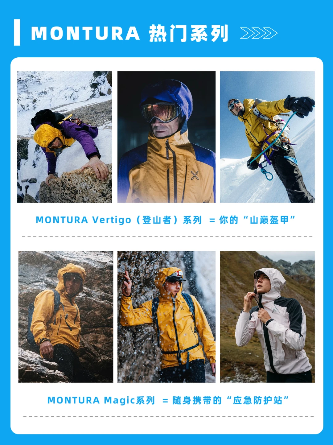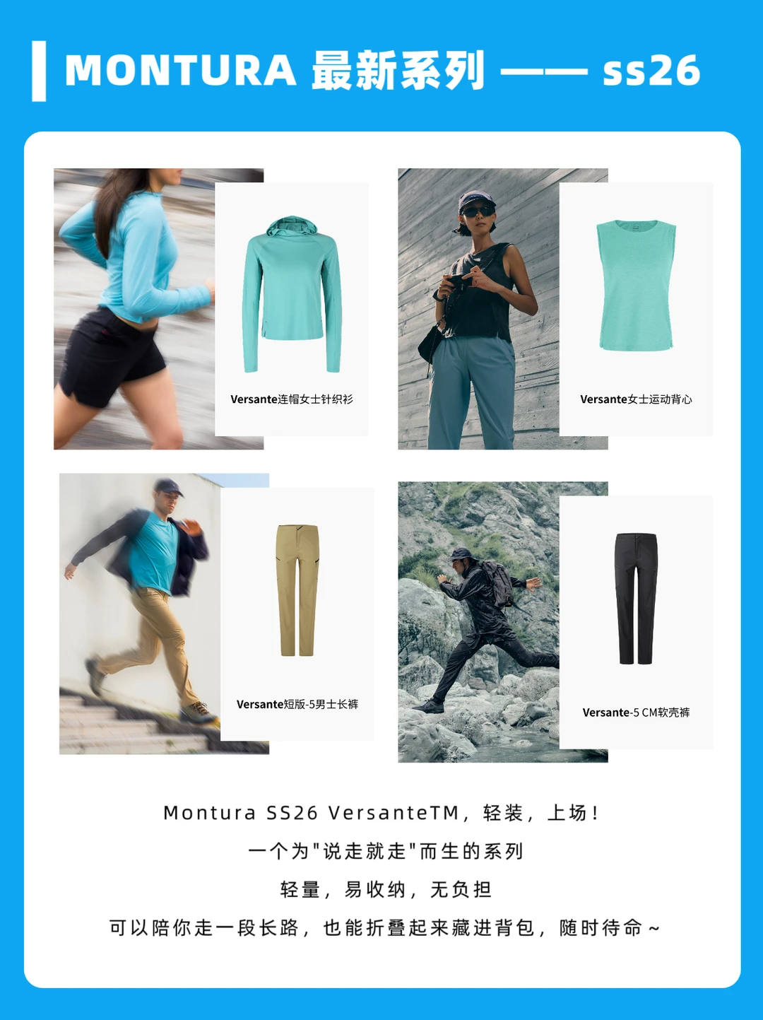 🔥当然除了这件可以陪你硬刚风雨的冲锋衣,MONTURA也有很多宝藏热门系列敲级值得入,如Vertigo(登峰者)系列、Magic系列等,同时MONTURA也将对山野的理解,延续到了日常的场景里,最新系列 Versante™ SS26春夏更是为‘说走就走’而生,主打轻装,上场!