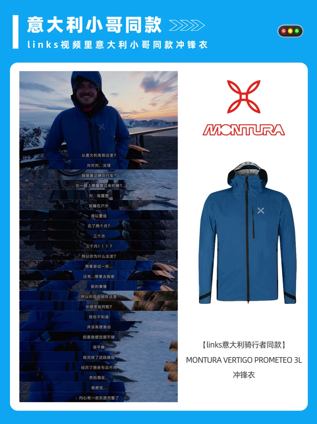👀顺便扒了一下,陪他一路历时三个月露营、穿过风雨的冲锋衣,居然来自MONTURA 这个品牌!🤯