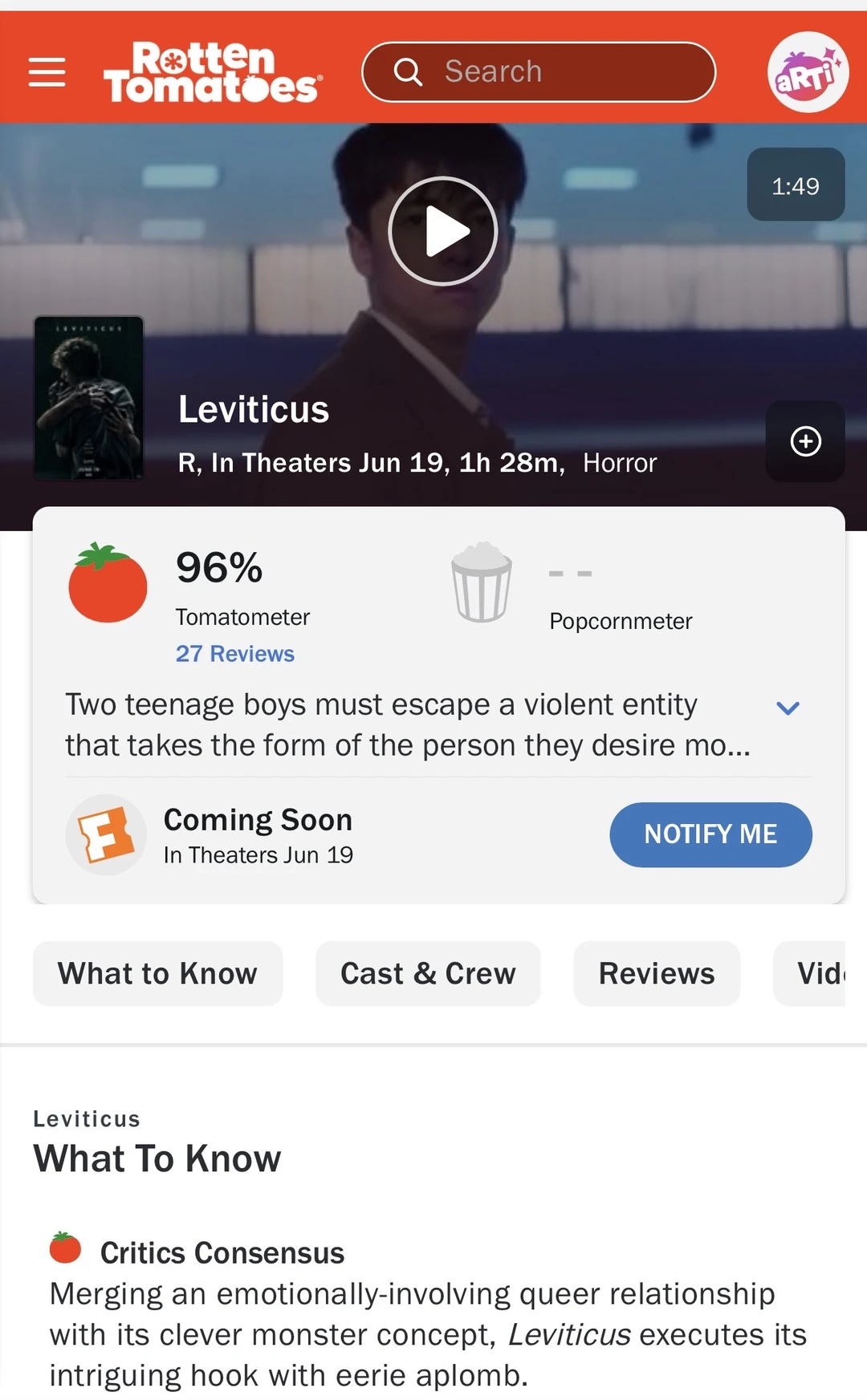 💥 聚焦青少年禁忌之恋的恐怖片《利未记》发布正式预告,画面很有料,电影目前烂番茄高达96%,Metacritic均分高达83,成为年度恐怖佳作之一。
