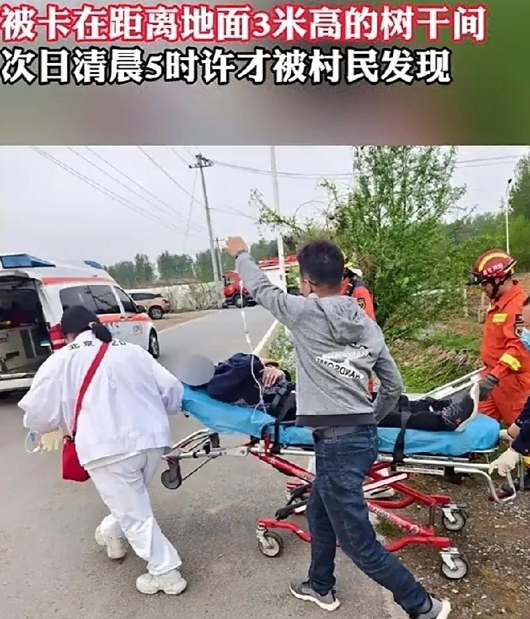男子虽然没被摔伤,但是处境也不妙,怎么也不能把腿从缝隙抽出来。可谓是叫天天不应,叫地地不灵。身体悬空倒挂在树上。