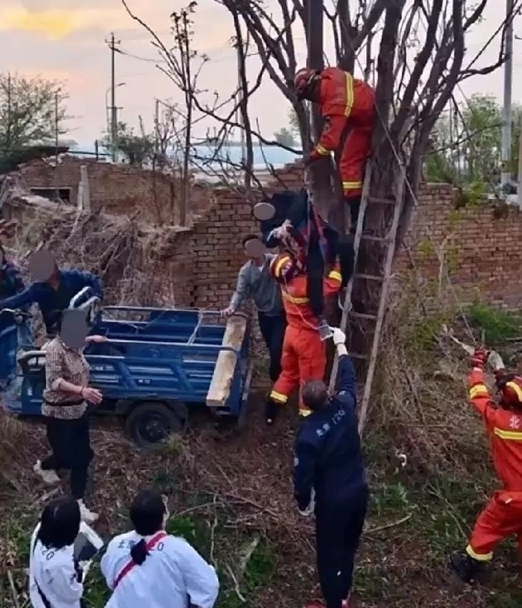 过了7个小时,凌晨5点,他才被村民发现,帮他报了警。救援人员与村民配合,松解树干缝隙,将男子腿部移出,平稳解救至地面。