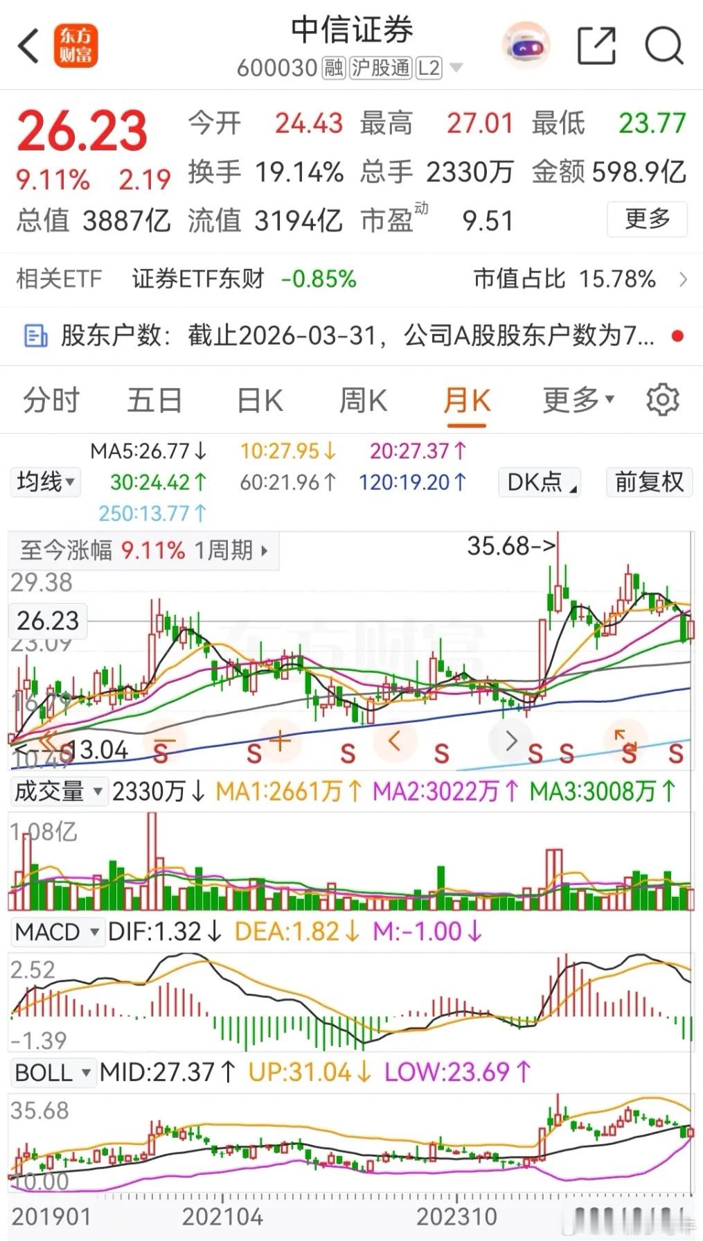 中信证券在2026年第一季度实现营业收入231.55亿元,同比+40.91% ;归母净利润102.16亿元,同比+54.60% ;扣非净利润102.03亿元,同比+56.97% ;基本每股收益为0.67元。截止周五收盘时为止,中信证券的报价26.23元/股,在四月份的累计涨幅为9.11%;而在2026年则是累计下跌了7.71% 。周五当天则是低开跳水后在低位盘整,尾盘时有所回升,收盘时跌了0.94% ,整体走势则是处于低位放量长阳后的回踩确认过程之中。