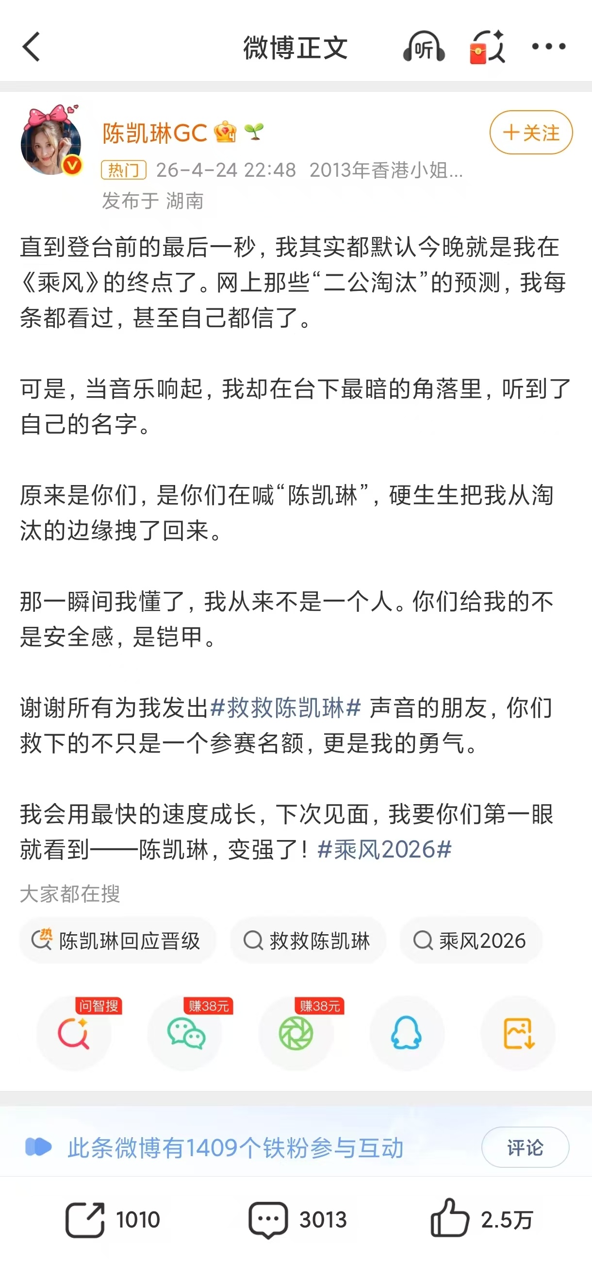 陈凯琳默认自己会被淘汰她以为自己要被淘汰了 没想到台下的声音 硬生生把她从边缘拽了回来 这些呐喊救下的不只是名额 更是她的勇气陈凯琳看了二公淘汰预测