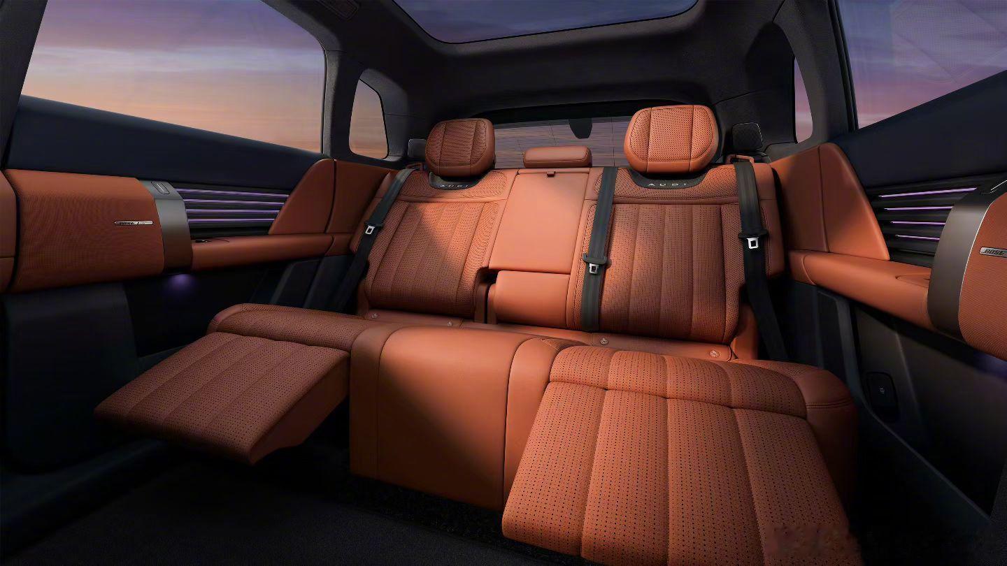 大五座,后排左右两张座椅带腿托,躺角似乎也很大。虽然看起来像喜羊羊与灰太狼里面的黑大帅,但这后排一眼中式五座SUV的风格。看起来怪反差的2026北京车展