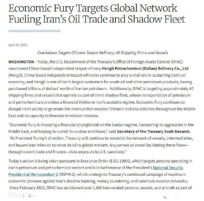 另外,美也不是一次这样做了,记得第一轮制裁的时候是在2025年3月21日,美方制裁的是山东鲁清石化,这也是首次制裁中国地炼。第二轮:2025年4月,山东胜星化工。第三轮是在2025年5月8日,河北鑫海化工还有3家港口码头。这一轮就是今年的4月24日。当然了我们也应该很快做出对等措施。