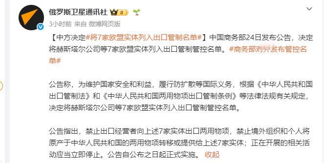 中方回应来了,将7家欧盟实体列入出口管制名单,禁止出口经营者向上述7家实体出口两用物项!