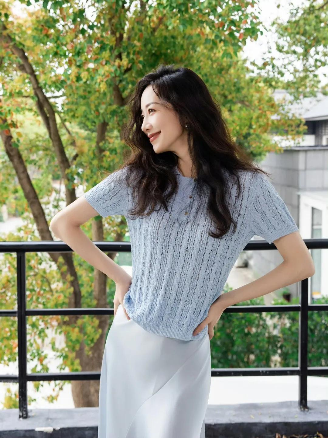 浅蓝镂空针织衫搭配同色缎面半身裙,温柔氛围感直接拉满~ 镂空设计自带呼吸感,显瘦又显气质,缎面裙摆垂坠感绝了,走路带风的样子太有女人味了!