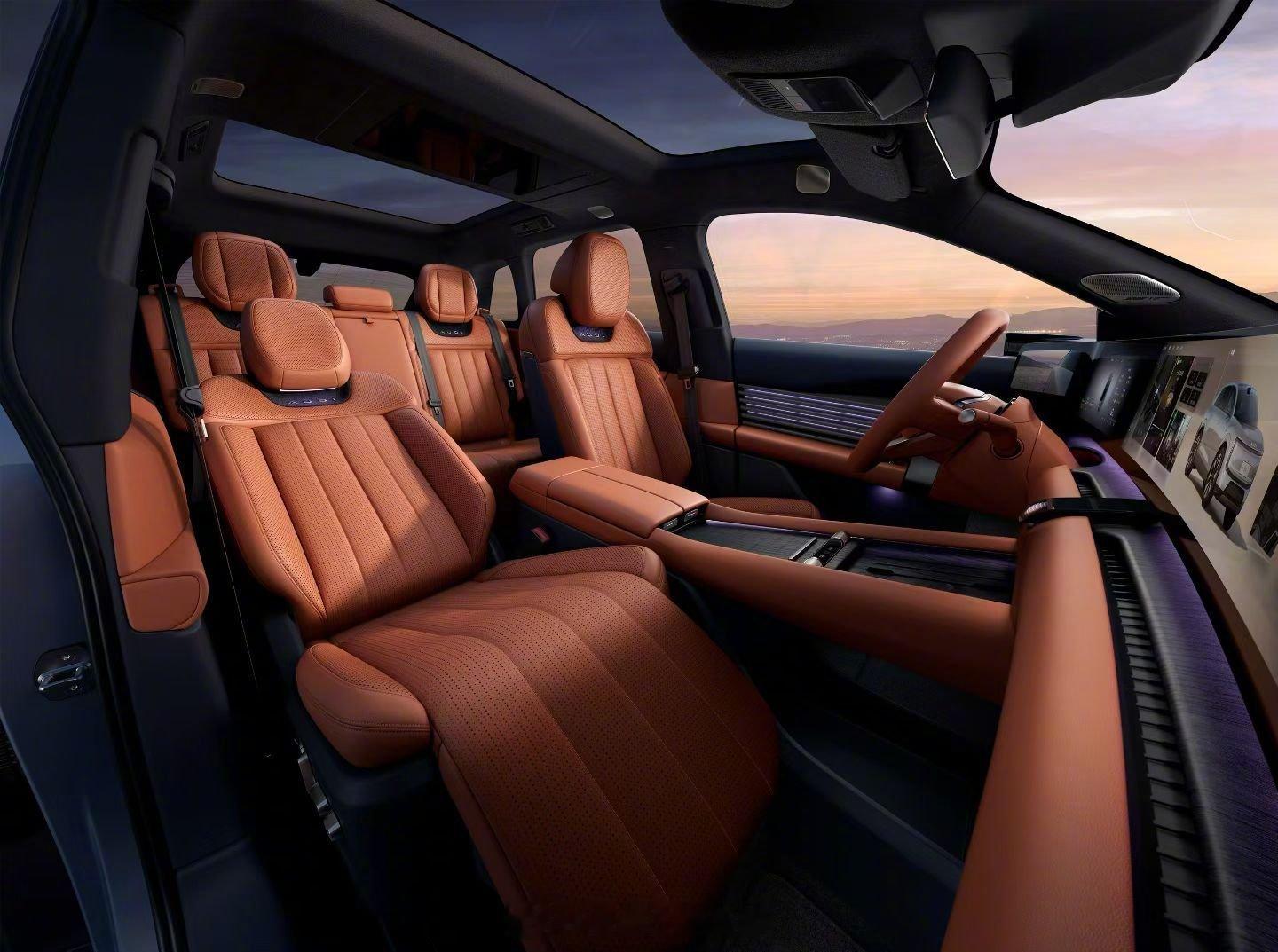 首先是材质。北美天然原木饰板,28道工序,1500小时手工打磨,保留真实木纹质感。这不是贴皮,是真的在用做家具的逻辑做内饰。座椅更狠——全球甄选5% A级头层牛皮,FeinNappa全粒面,透气性好,触感细腻。这两样东西加在一起,给人的感觉不是"坐进一辆车",是"走进一个空间"。
