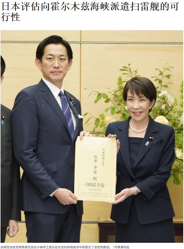 据《日本时报》报道,自民党政调会长小林鹰之在4月24日向首相高市早苗递交了建议书,核心意思就一个:等美伊仗打完了,日本得赶紧出动扫雷舰去“做贡献”。高市早苗对此心领神会,给出的回应是“保护国民日常生活”。