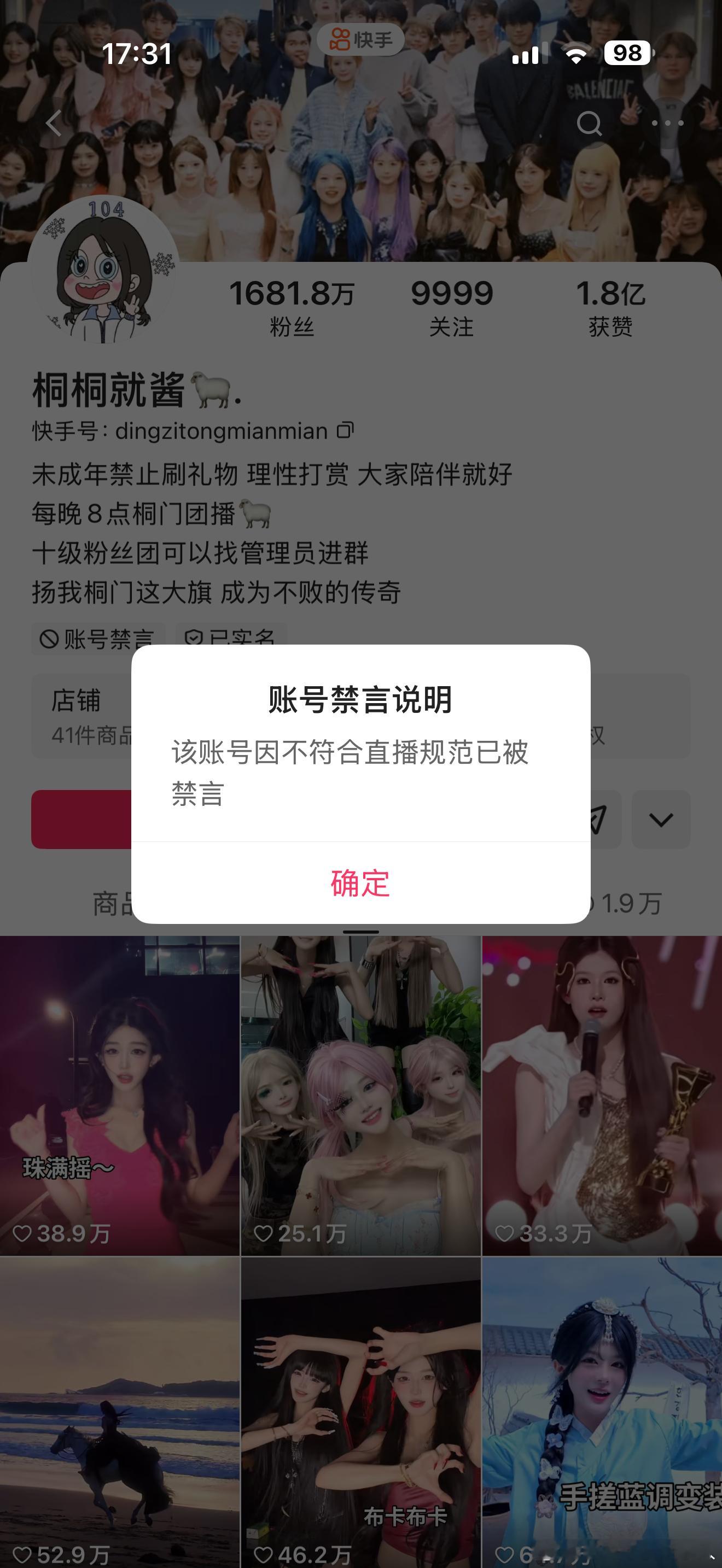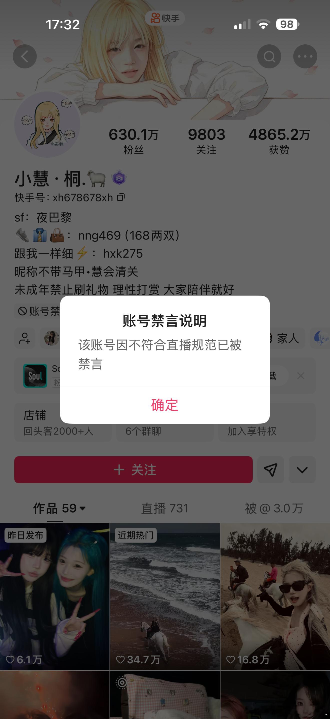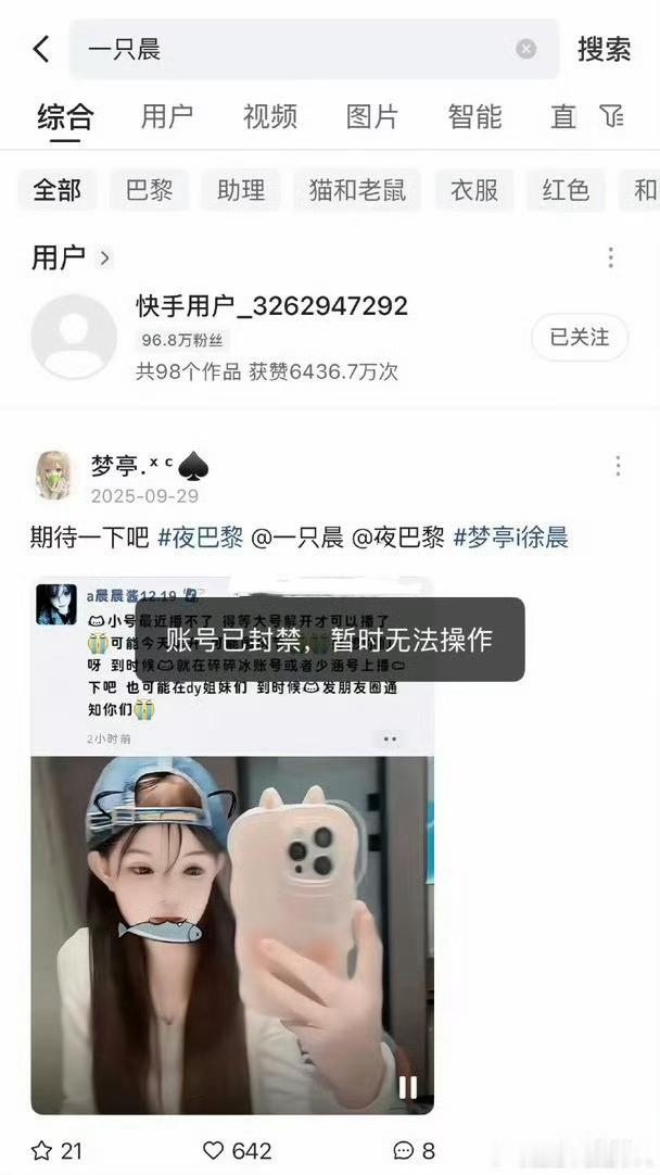 嘉火文化除了“夜巴黎”账号被封禁外,旗下的桐桐,乖琴枝,非非,小慧,一只晨账号都被禁言!