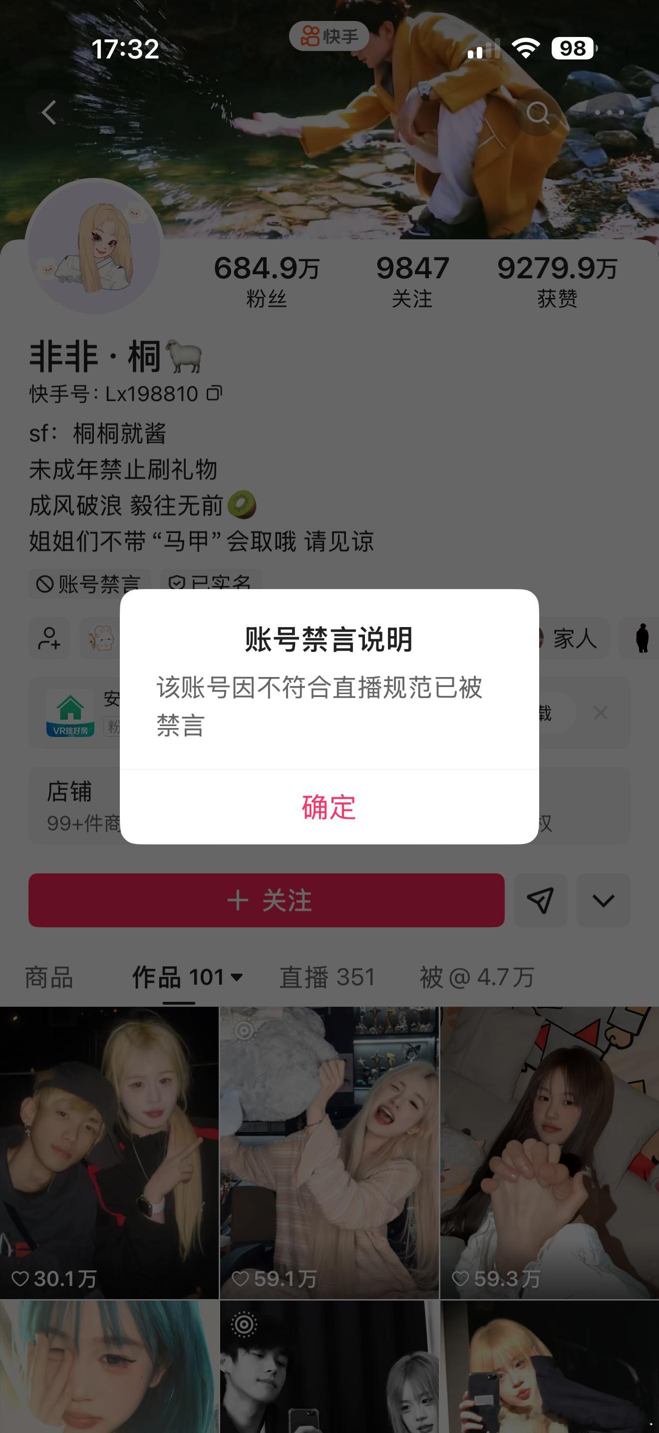 嘉火文化除了“夜巴黎”账号被封禁外,旗下的桐桐,乖琴枝,非非,小慧,一只晨账号都