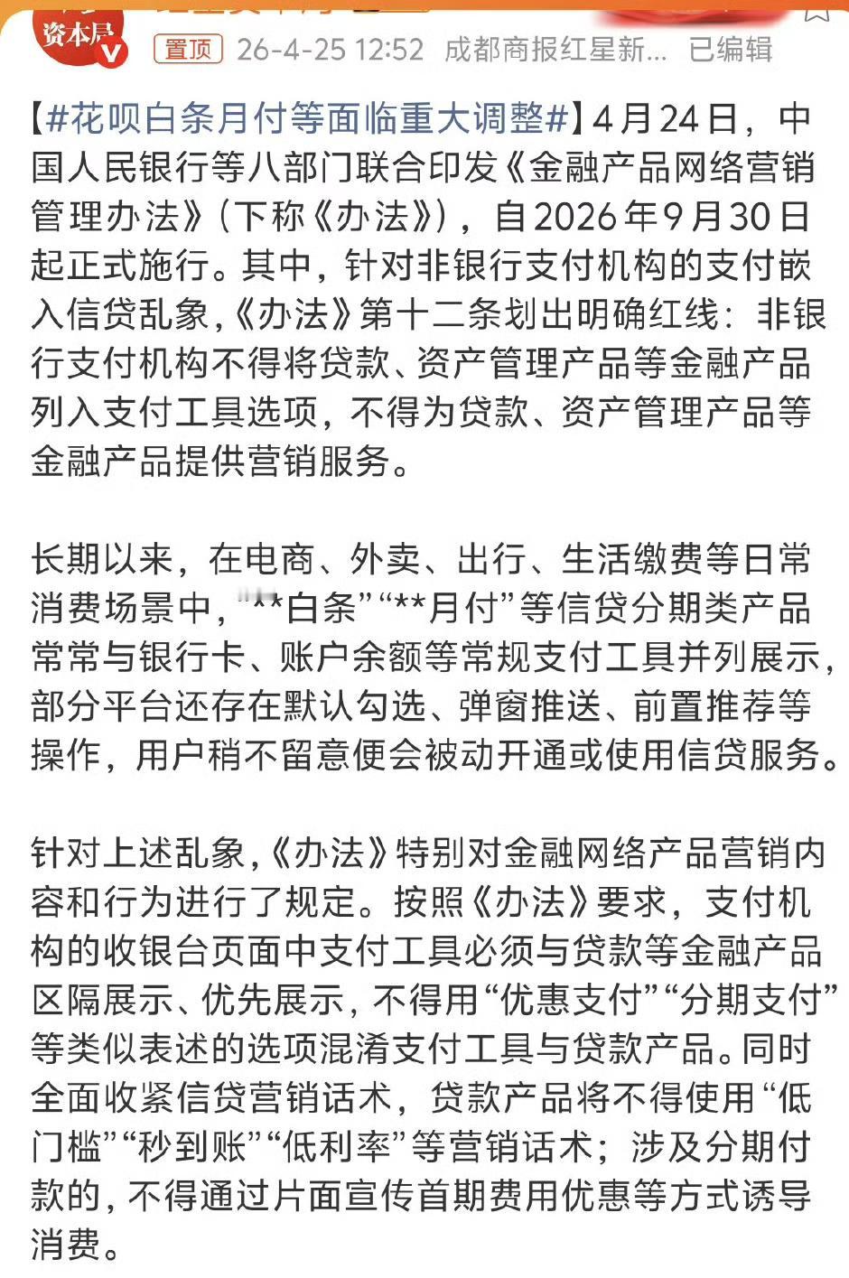 2026年4月24日,央行等八部门印发的《金融产品网络营销管理办法》,9月30日起施行,花呗、白条、月付等要面临重大调整了。