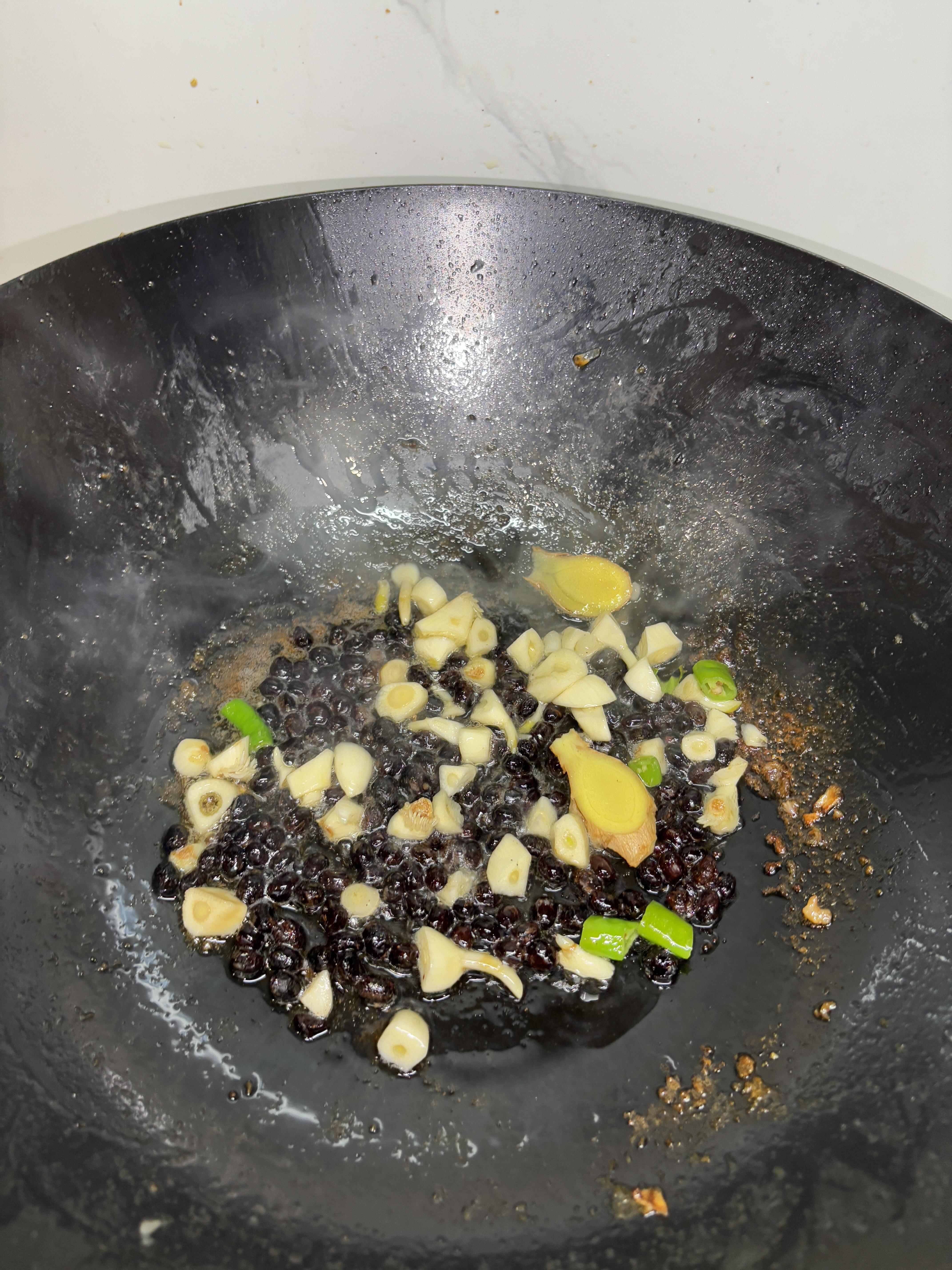 2. 锅中倒适量油,油热后放入肉沫,大火快速炒至变色,再加入1勺豆豉、蒜末和青椒,继续翻炒,炒出浓郁的香味。