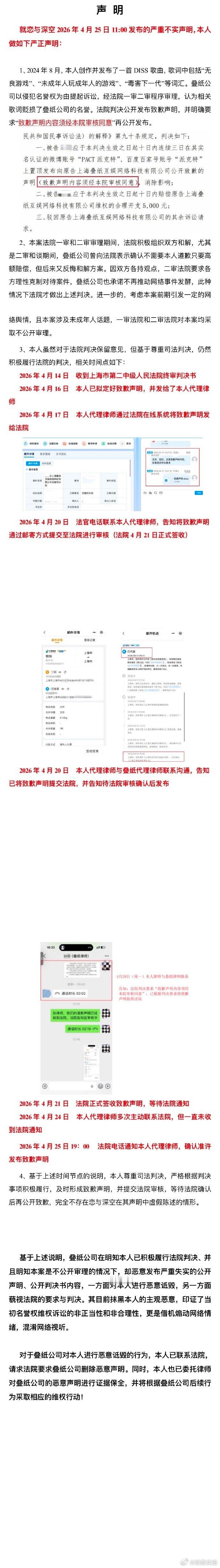 随后,派克特发声明指控恋与深空2026年 4月 25日 11:00发布声明严重不实。并晒出司法诉讼时间节点进行说明。他表示,“本人尊重司法判决,严格根据判决事项积极履行,及时形成致歉声明,并提交法院审核,等待法院确认后再公开致歉,完全不存在恋与深空在其声明中虚假陈述的情形”。