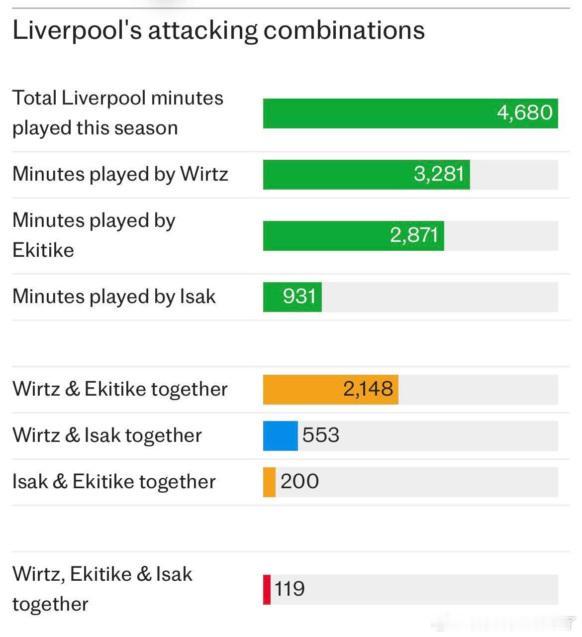 每日电讯报记者多米尼克金透露尽管斯洛特不愿多做解释,但这里有一个数据:伊萨克、维尔茨和埃基提克整个赛季只一起上场了119分钟,分布在六场比赛中。