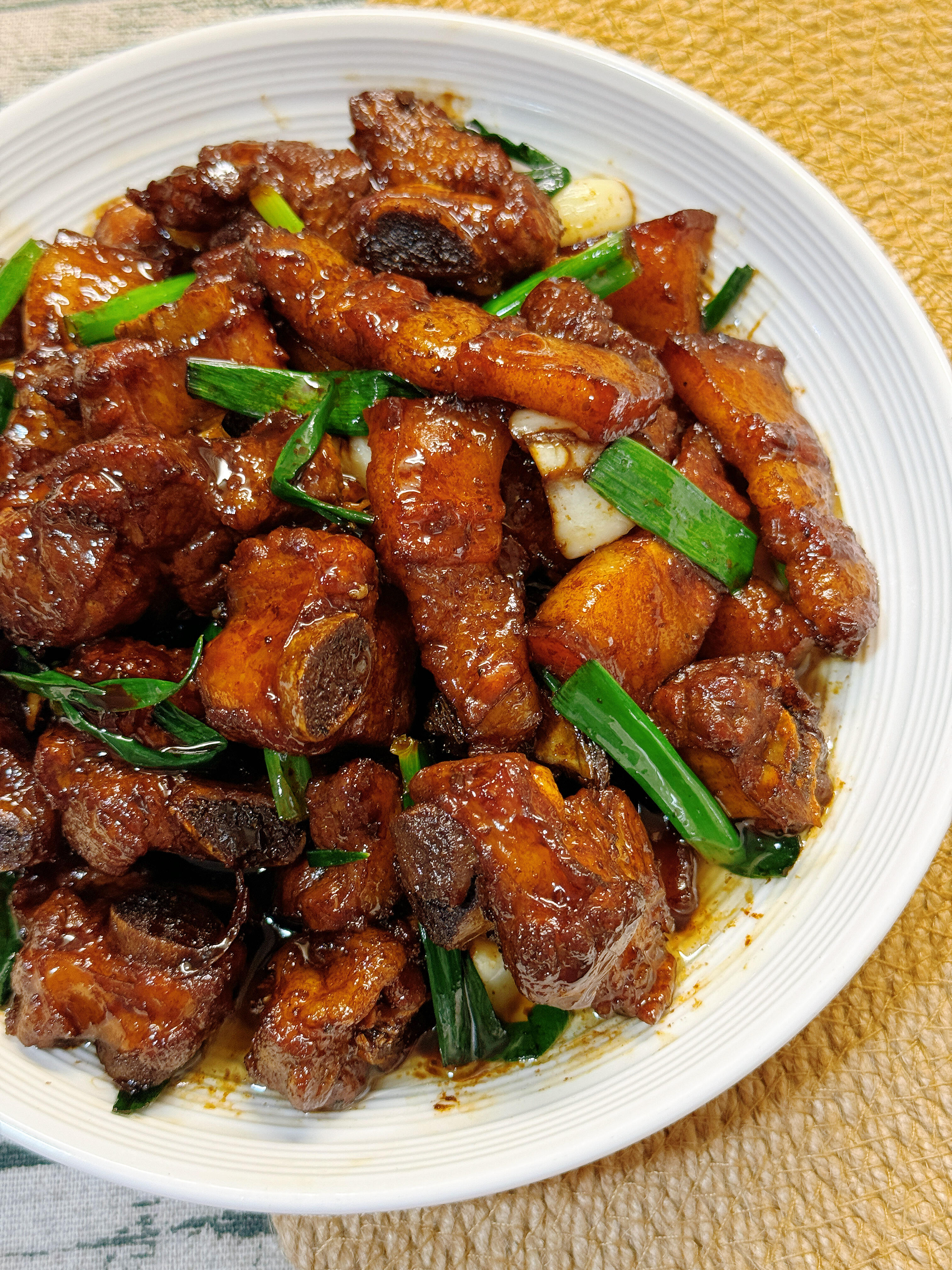 4. 等锅中汤汁收得差不多时,放入蒜粒,开大火翻炒,炒出蒜香,边翻炒边继续收汁,直到汤汁变得浓稠,紧紧裹在每块肉上,出锅前放入葱段,快速炒匀,即可起锅。