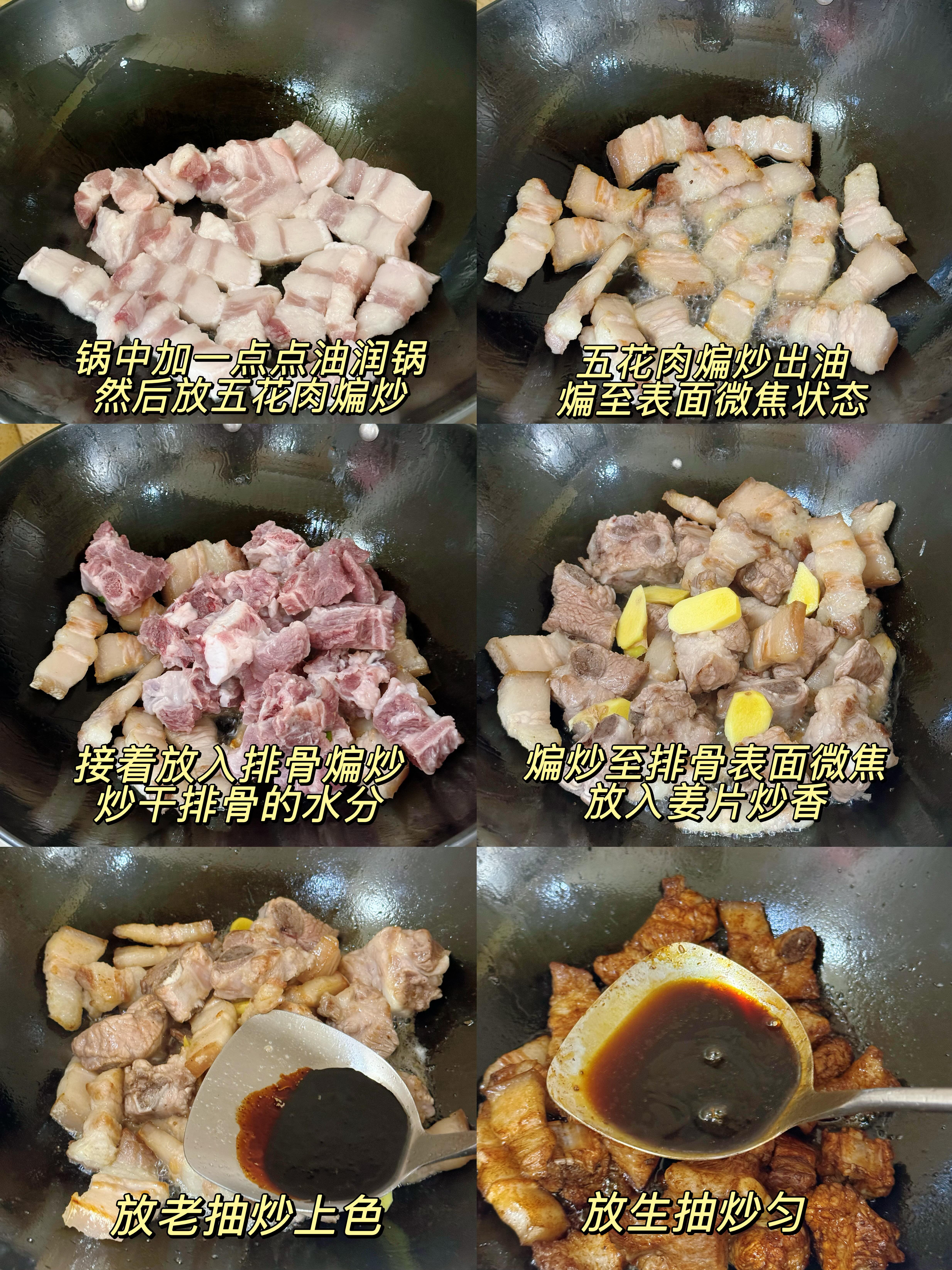 2. 锅中放一点点油润锅即可,不用多放(五花肉会煸出很多油脂),油热后放入五花肉,小火慢慢煸炒,煸到五花肉表面微微发焦,逼出里面的油脂,接着倒入排骨,大火快速翻炒,炒出排骨表面的水分,直到锅中只剩清油,且排骨表面变得微微焦黄。