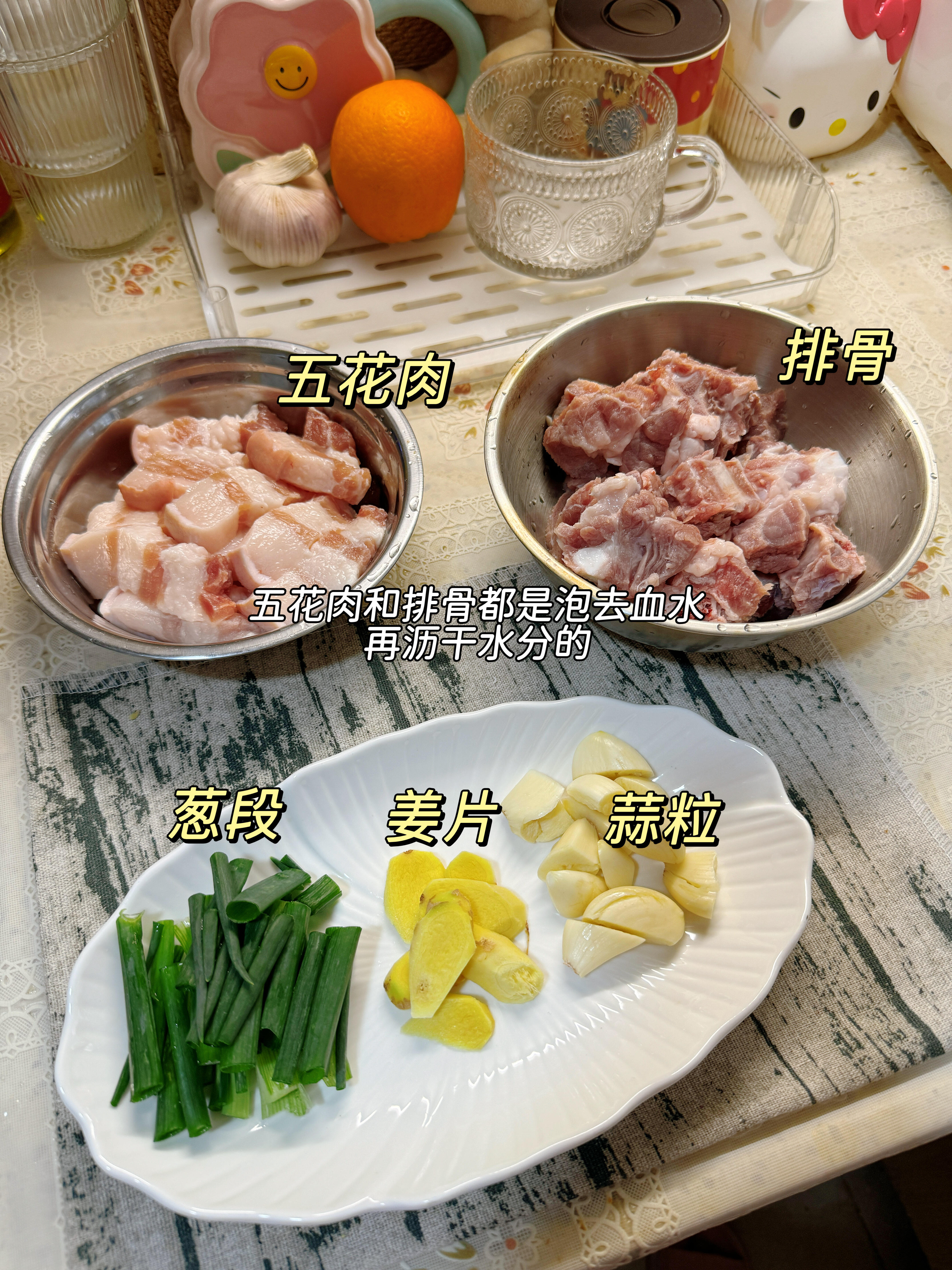 1. 先准备好五花肉和排骨,放入清水中泡去血水,泡好后捞出,用厨房纸吸干表面水分,备用(泡去血水能减少腥味,口感更清爽)。