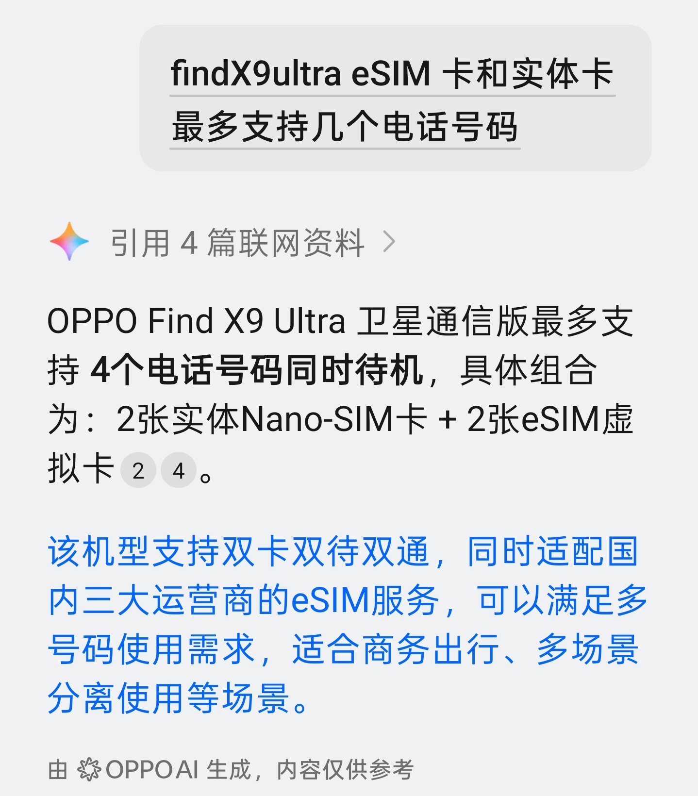 数码闲聊站 findX9ultra虽然支持eSIM卡,但貌似卡槽2与eSIM只能二选一,如果支持三个号码,倒是有一张卡可以改为流量卡。但问了下豆包,却表示可以一共支持三个号码,究竟谁说的对啊findX9ultra选择困难症oppofindx9ultraesim 得,问了下小布,居然说同时支持四个号码,我该相信谁