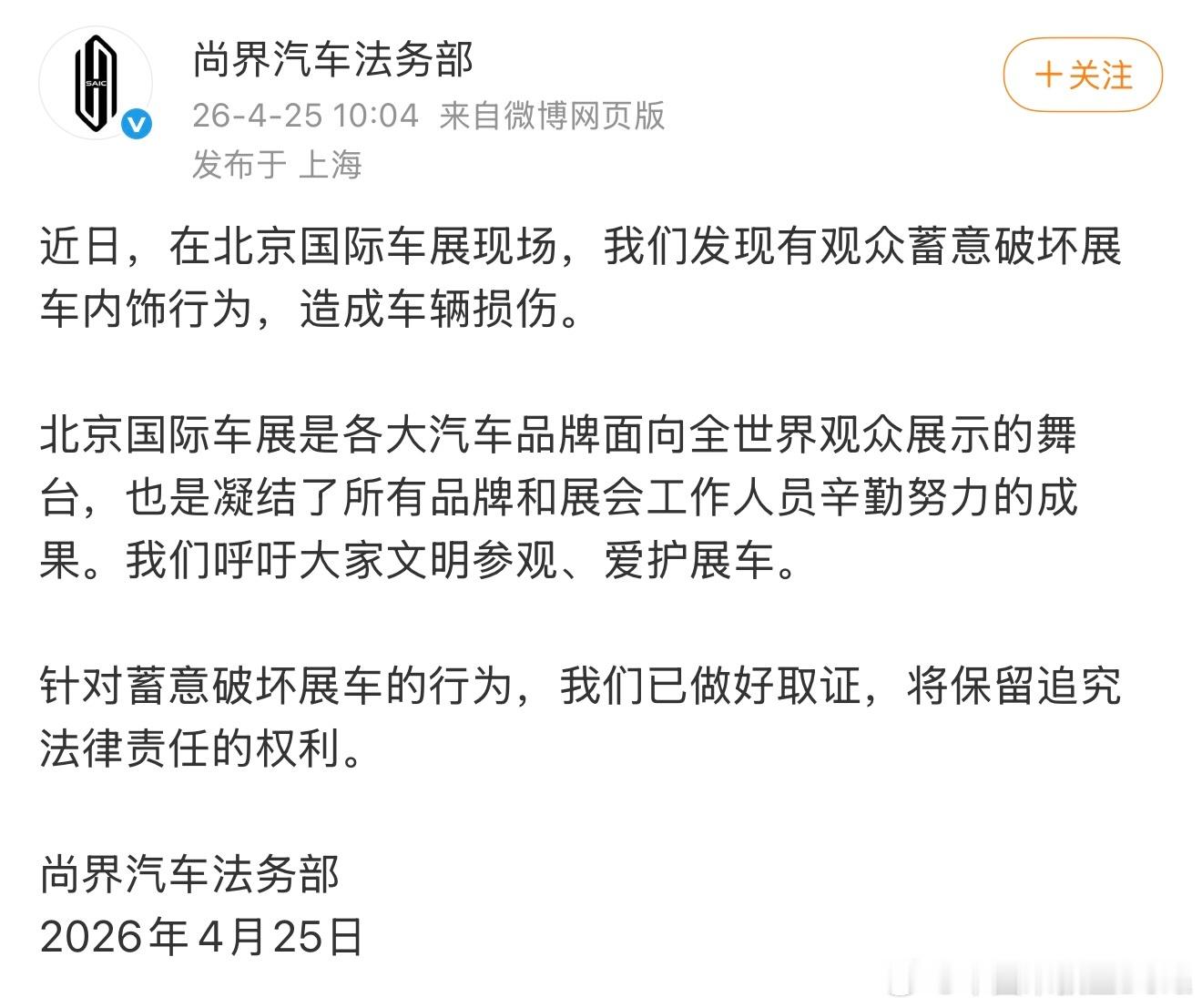 发文称,北京国际车展有观众蓄意破坏展车内饰,造成车辆损伤。此前懂车帝发视频称,尚