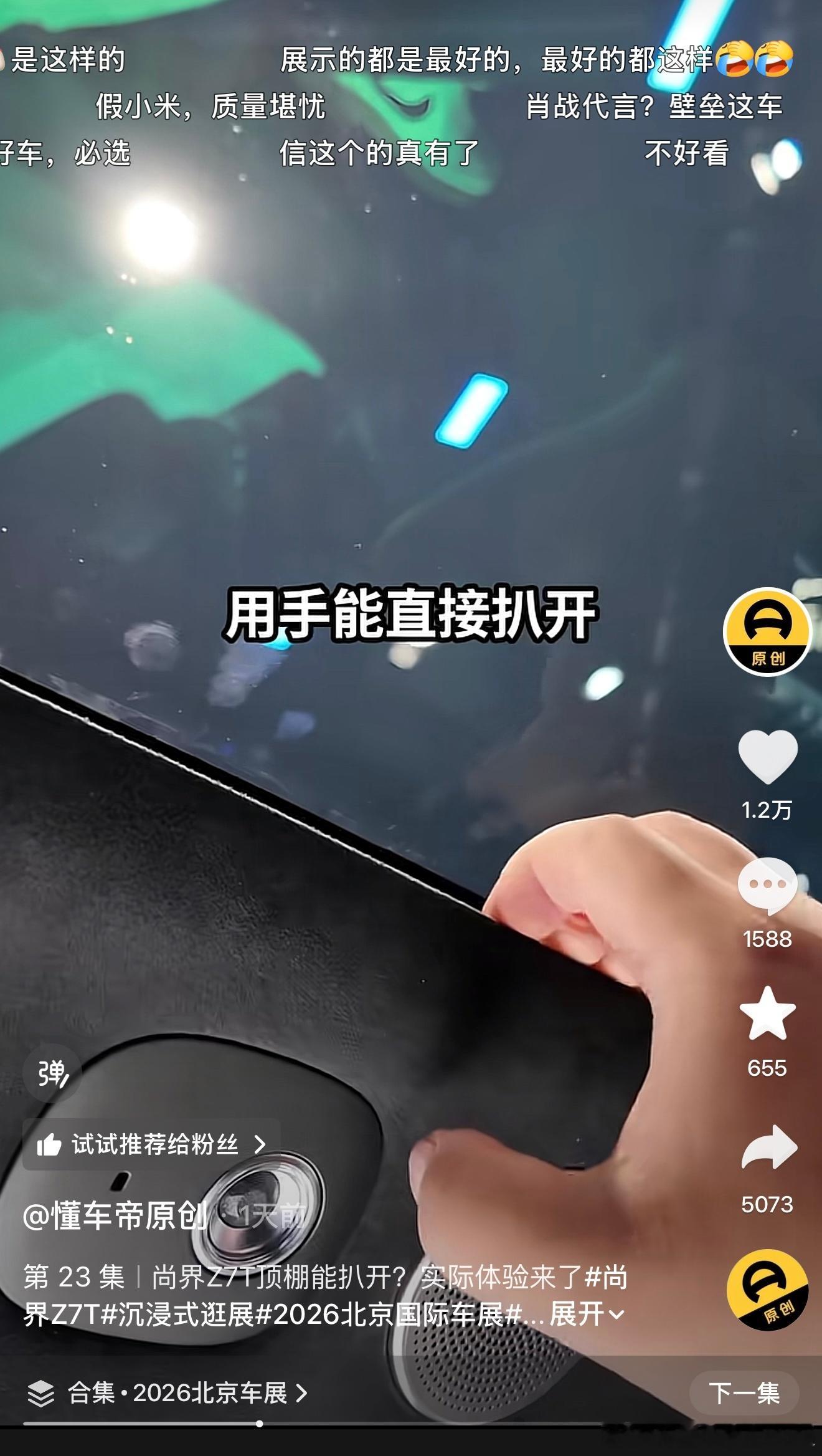 发文称,北京国际车展有观众蓄意破坏展车内饰,造成车辆损伤。此前懂车帝发视频称,尚界Z7展车存在网传的用手能直接扒开顶棚内饰的情况。尚界回应有人蓄意破坏展车内饰尚界法务部已取证