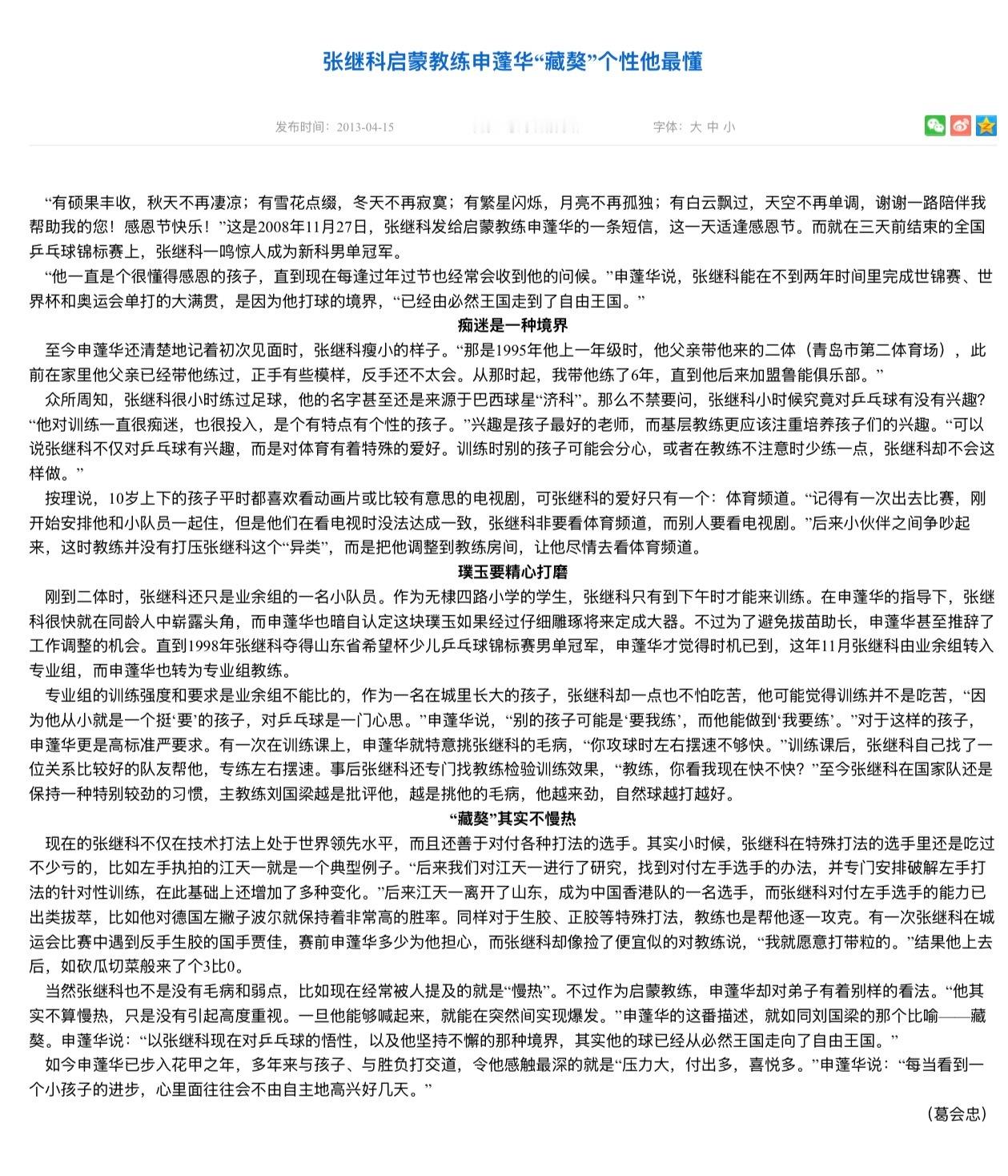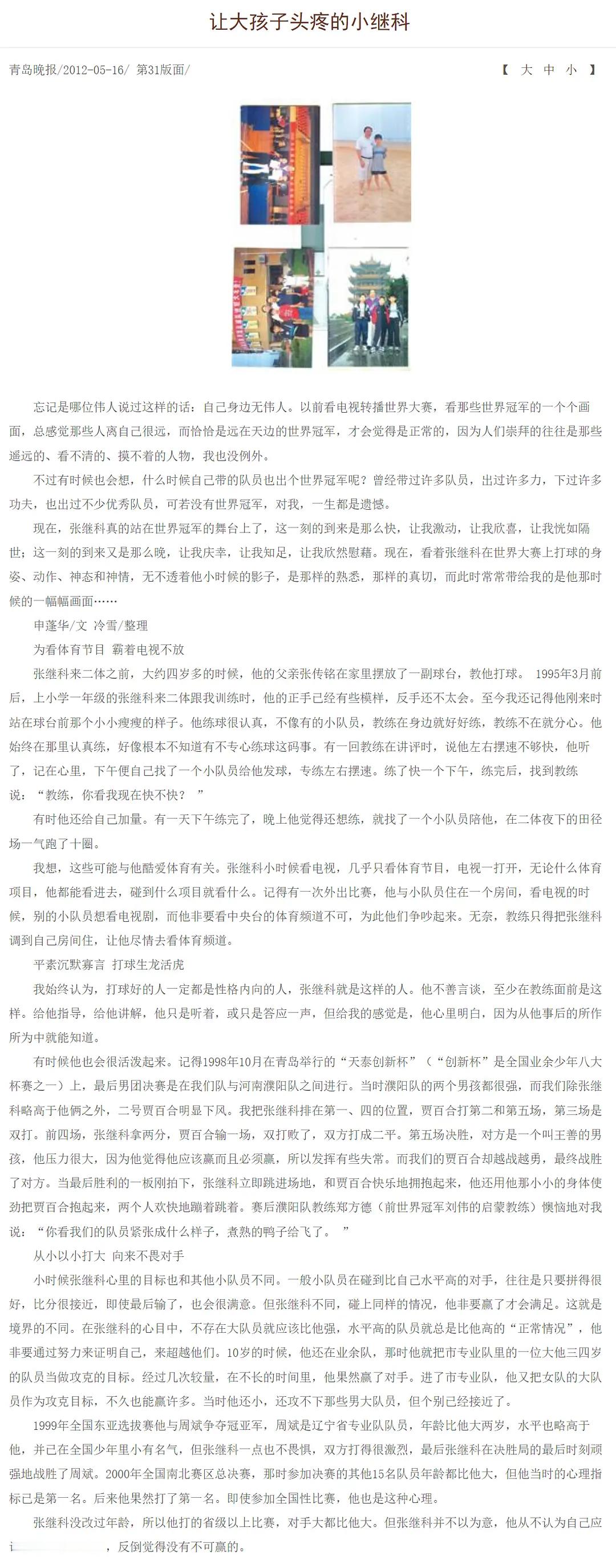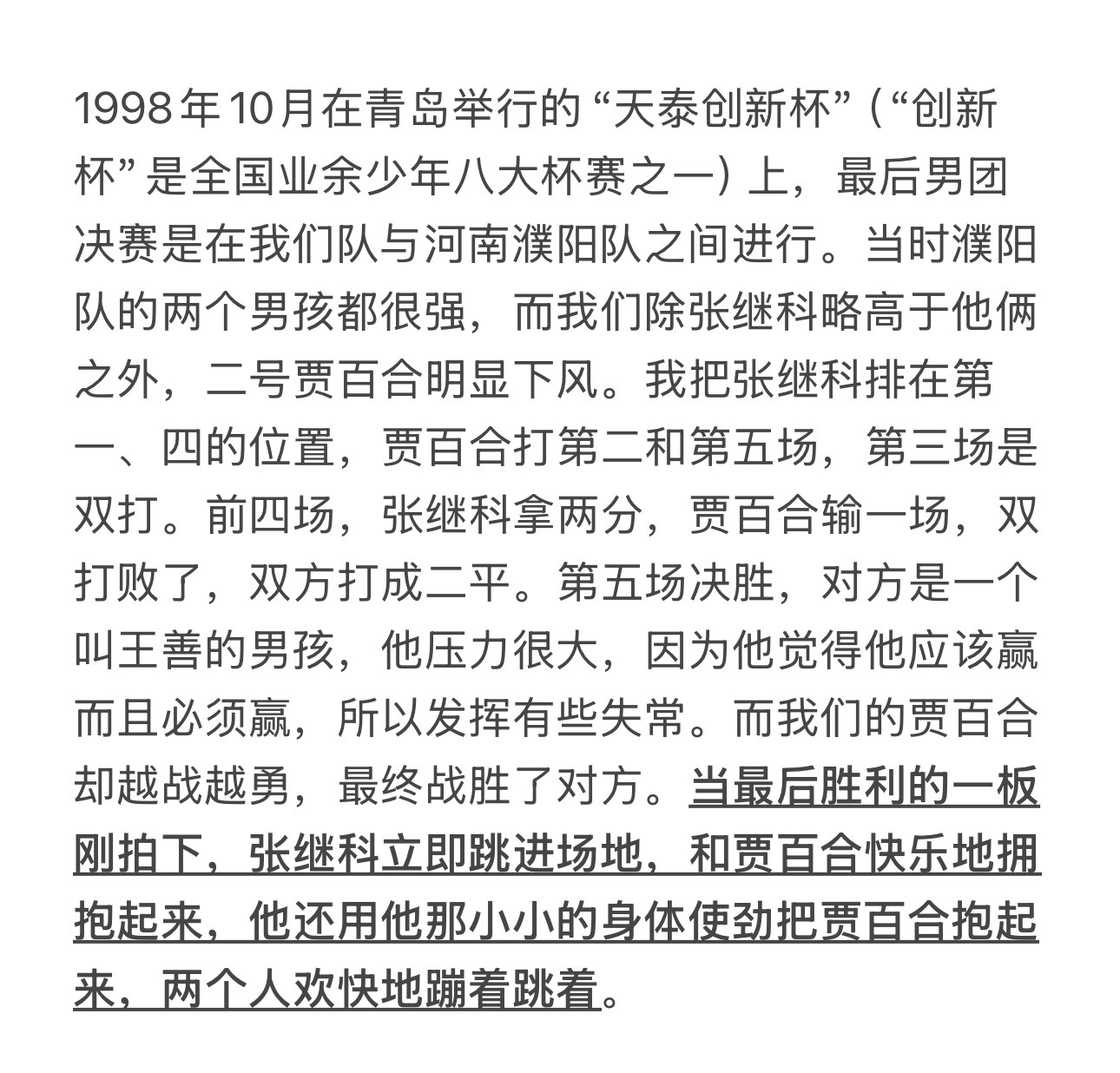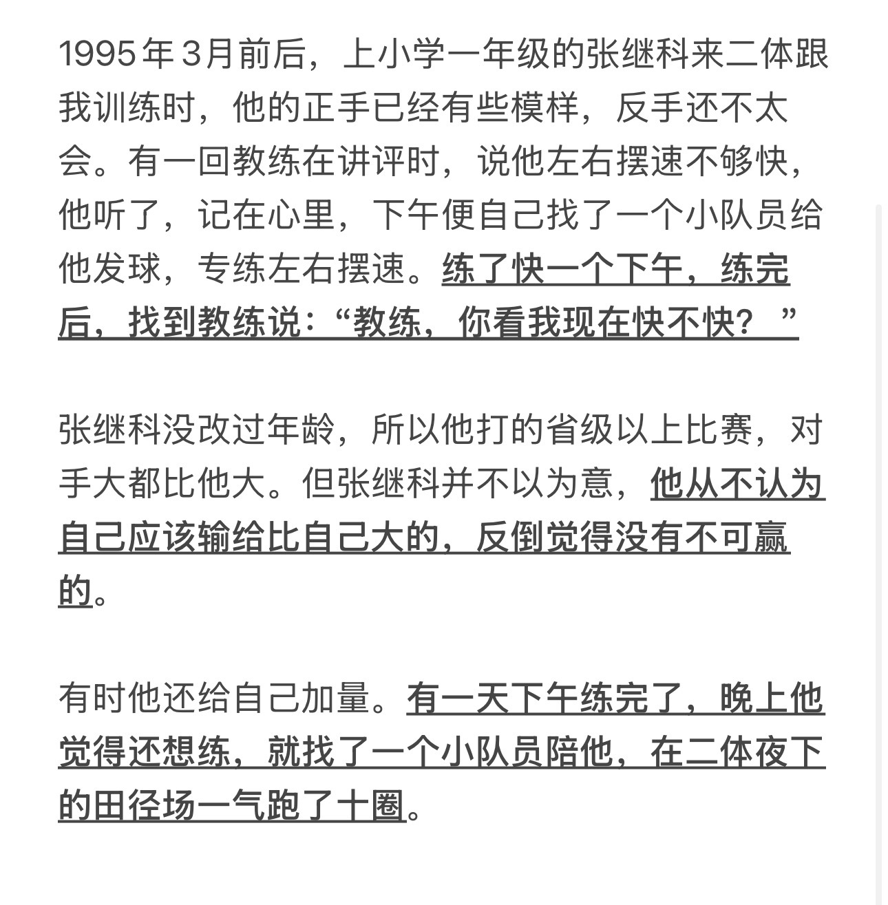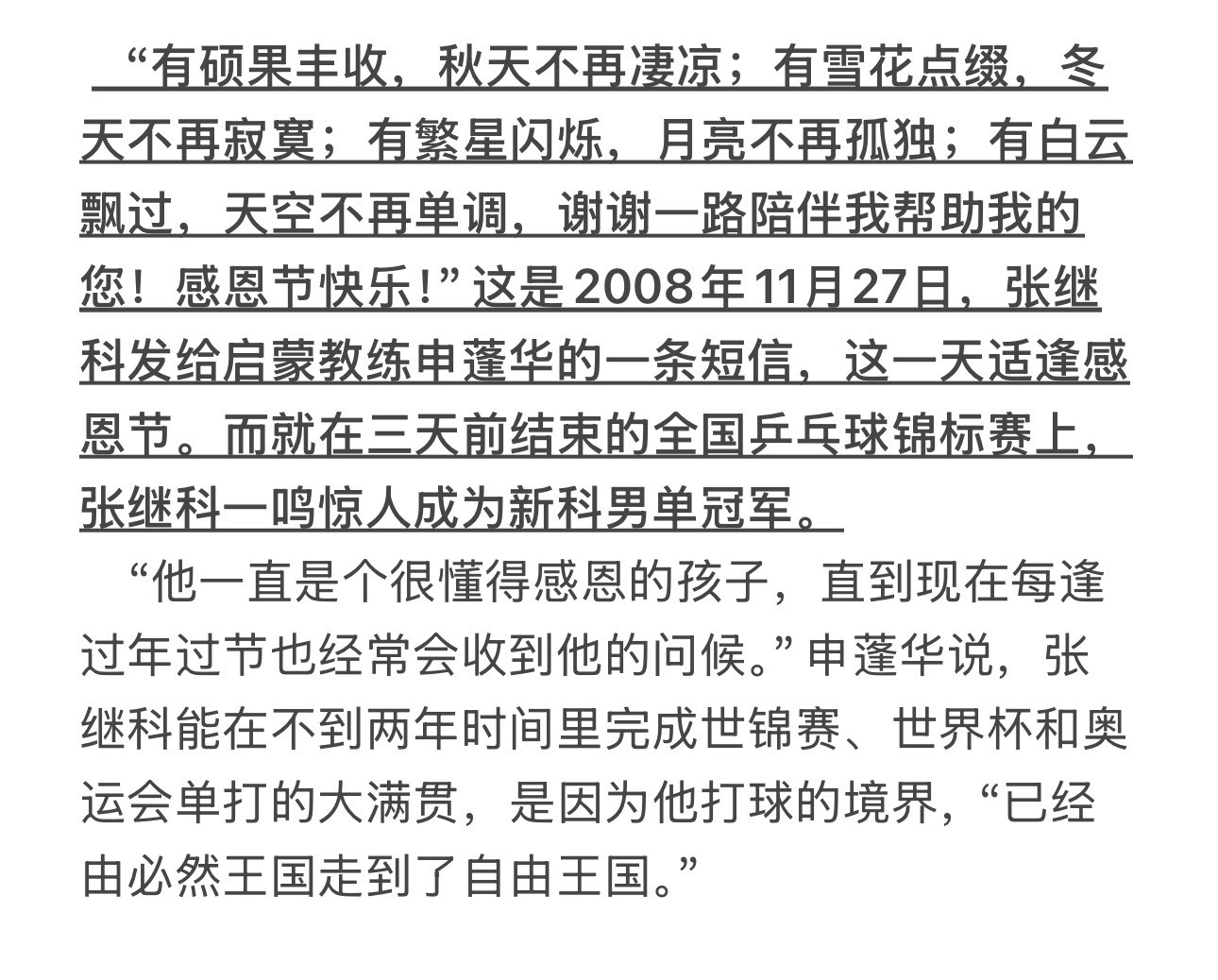 张继科 启蒙教练口中的小继科就是一只埋头加练一心只有体育的小倔强,是不怕大选手的初生牛犊,更是在获得全锦赛冠军后记得给他发消息感恩的好小孩。 “有硕果丰收,秋天不再凄凉;有雪花点缀,冬天不再寂寞;有繁星闪烁,月亮不再孤独;有白云飘过,天空不再单调,谢谢一路陪伴我帮助我的您!感恩节快乐!”