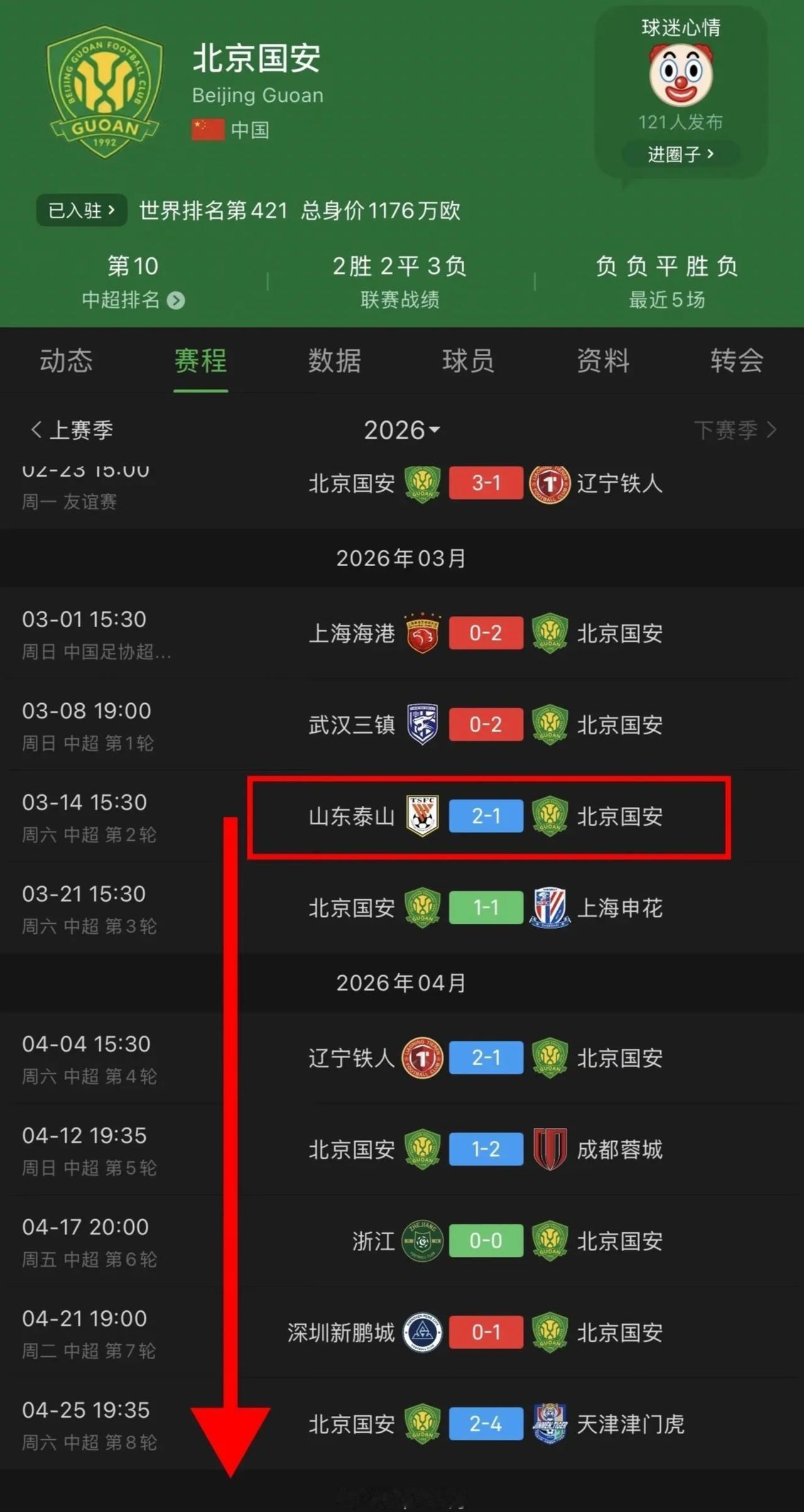 上赛季踢泰山队之前,国安4连胜,一度成为夺冠最大热门,结果客场被泰山队6-0横扫。从此一蹶不振,连续输球跌出争冠集团,最后区区第四。