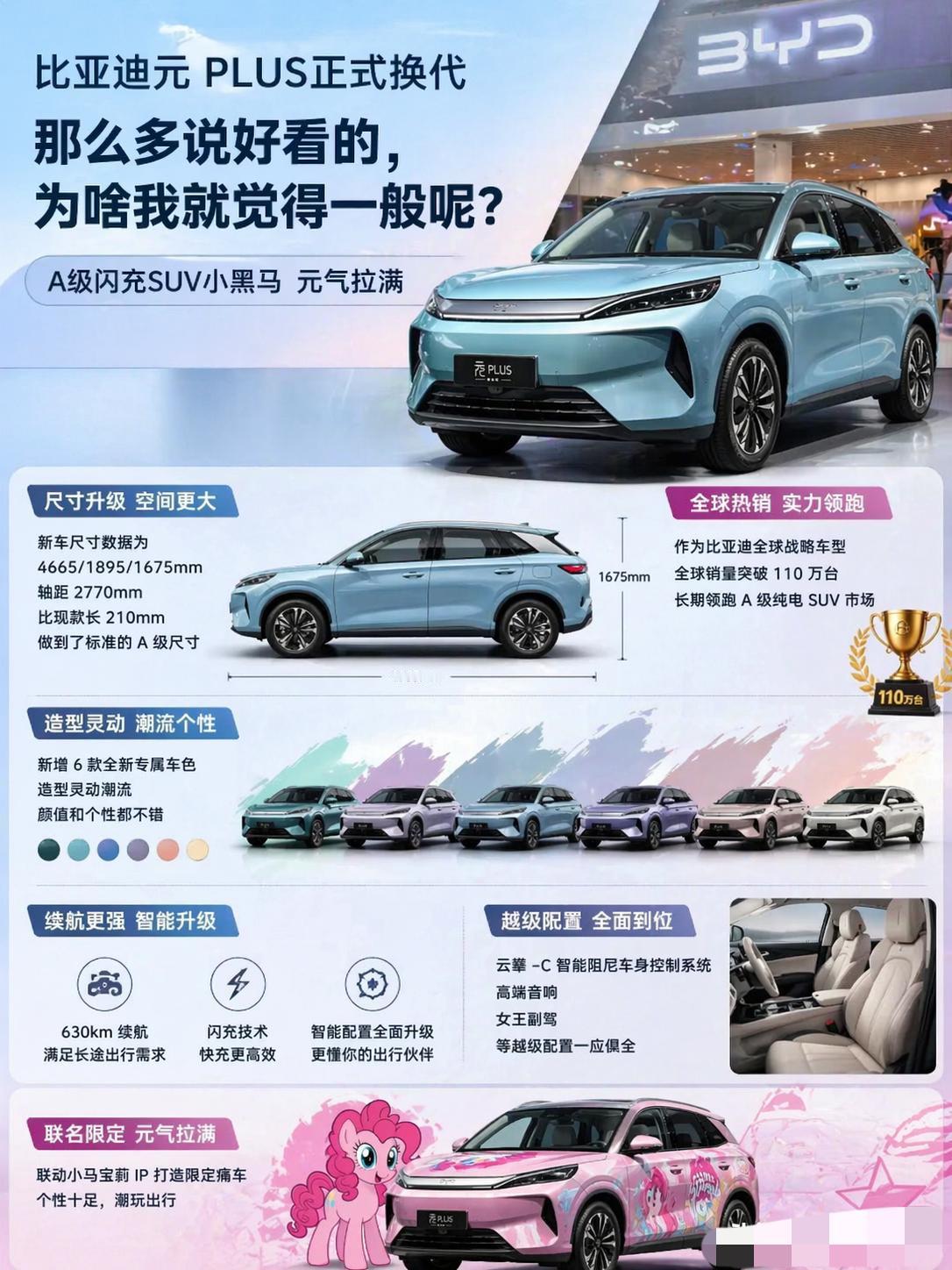 我更倾向于后者的冷静。元PLUS这些年卖得确实猛,累计销量都破110万辆了,是A级纯电SUV里的爆款。爆款做多了,最怕的就是“平庸化”。换代后尺寸拉到4665mm,轴距2770mm,空间越级、配置拉满、闪充也安排上,产品力没得说。但设计上明显在“去棱角化”,把容易引起争议的地方全磨平,换来的是更低的审美门槛和更大的受众面,代价就是辨识度被稀释。