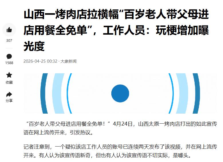 4月24日山西太原的寒意刚刚褪去,街头还带着一丝微凉,一家不起眼的烤肉店,却因为一条横幅,瞬间吸引了所有路人的目光,一下子就火了起来,这条横幅上写着一句话:“一百岁老人带父母进店全免单”,看似简单的一句话,却引发了不小的讨论。