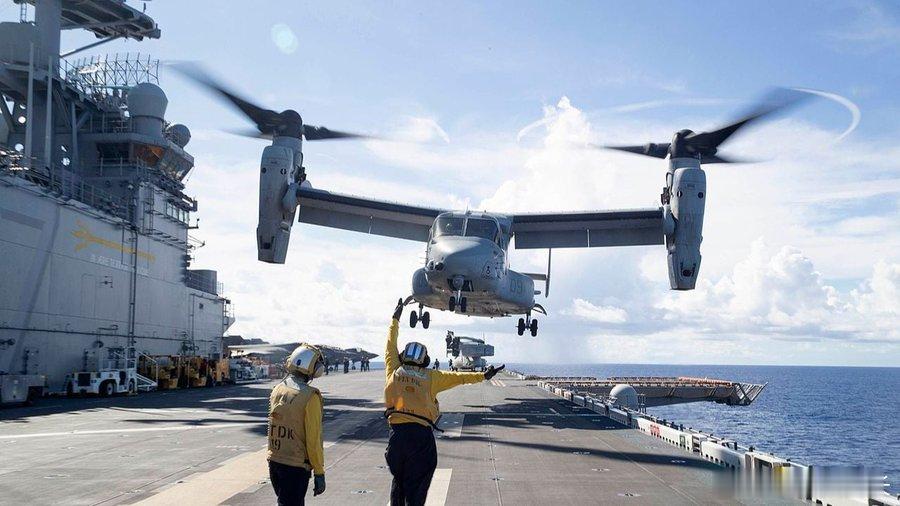 🚁 美国海军陆战队MV-22B“鱼鹰”倾转旋翼机,编号168629,从阿布扎比返回“的黎波里”号两栖攻击舰。