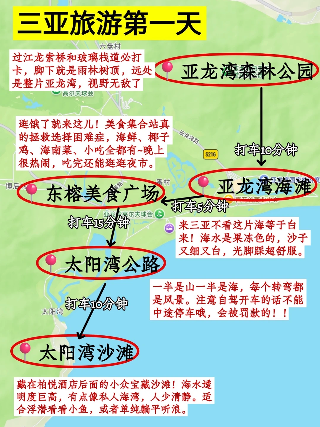 路线:亚龙湾热带天堂森林公园 → 亚龙湾海滩 → 东榕美食广场(午餐)→ 太阳湾公路 → 太阳湾沙滩(看日落)