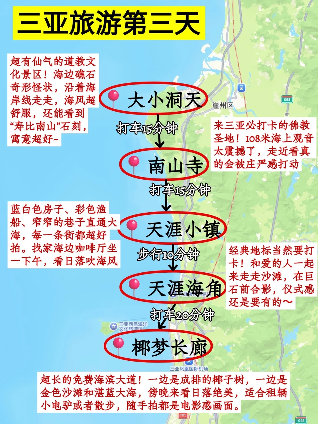 路线:大小洞天 → 南山寺(海上观音)→ 天涯小镇 → 天涯海角 → 椰梦长廊(看日落)