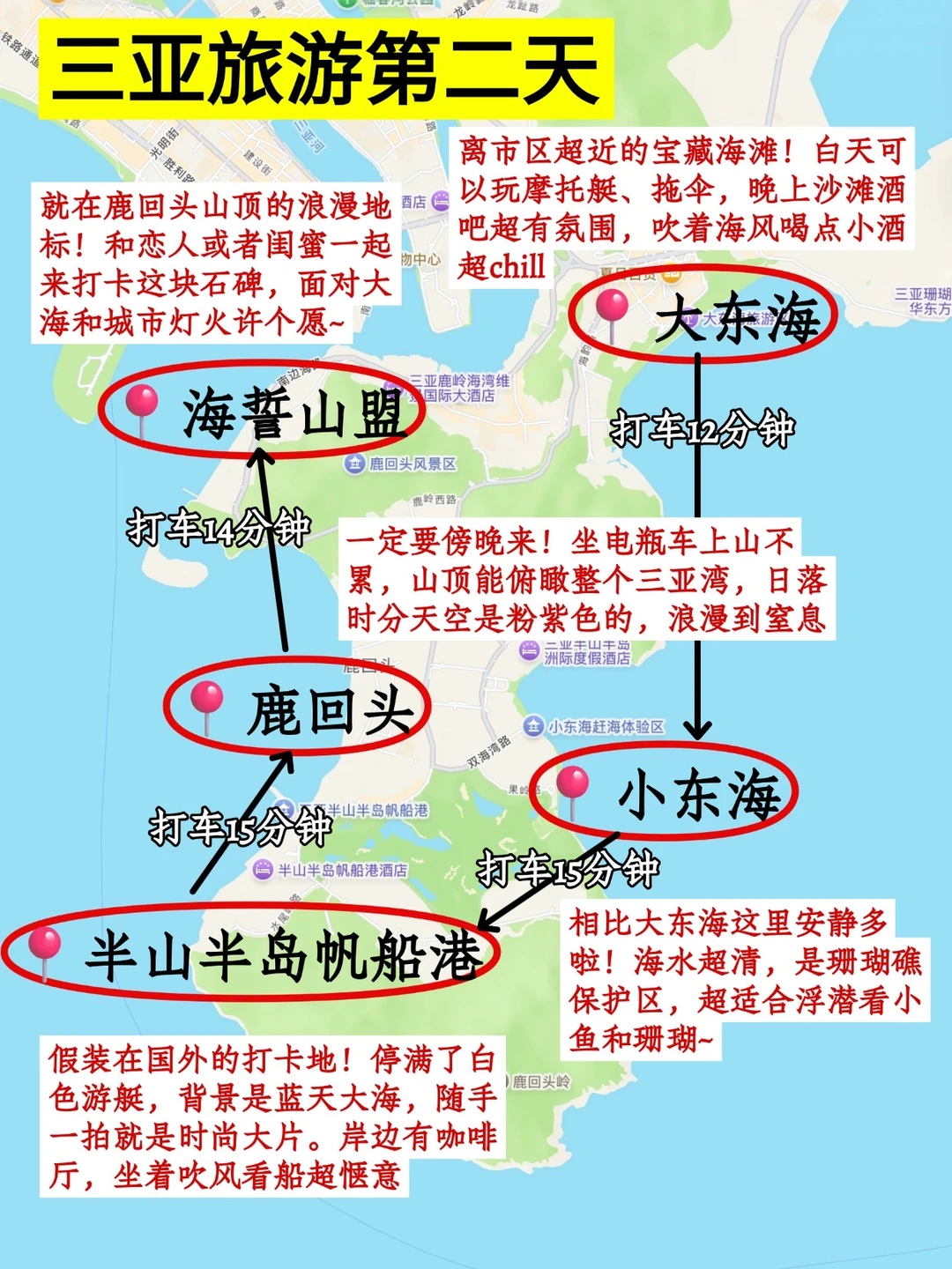 路线:大东海 → 小东海(摄影基地)→ 半山半岛帆船港 → 鹿回头风景区 → 海誓山盟