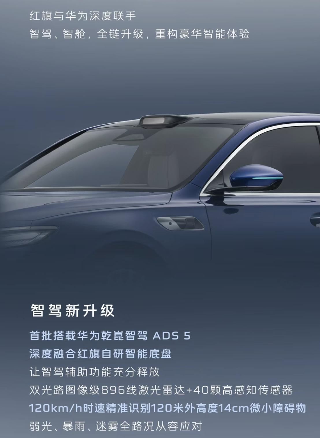 全新红旗H9搭载华为乾崑智驾ADS 5.0,有华为自研896线激光雷达...