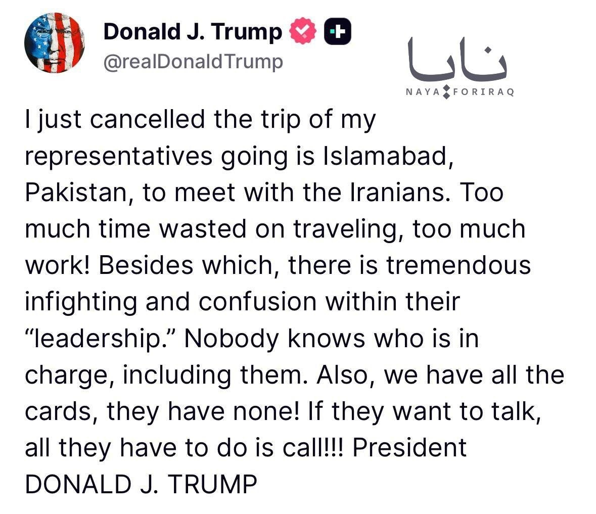 🔻NAYA 通讯社报道,特朗普刚刚在社交媒体上表示:“我刚刚取消了派代表前往巴基斯坦伊斯兰堡与伊朗人会面的行程。旅行浪费了太多时间,工作太多了!此外,他们的'领导层'内部存在巨大的内斗和混乱。没有人知道谁在负责,包括他们自己。而且,我们拥有所有的牌,他们一张都没有!如果他们想谈,他们只需要打个电话!!!”🔻周五,在宣布此次行程后,特朗普告诉路透社:“我们现在正在与负责人打交道。”🔻但就在前一天,特朗普在白宫椭圆形办公室对记者表示,美国并不清楚伊朗的领导人是谁。🔻刚刚已经离开巴基斯坦的伊朗外长阿拉格奇在社交媒体上表示:“对巴基斯坦的访问非常富有成果。我们非常赞赏巴基斯坦为恢复我们地区的和平所作的善意努力和兄弟般的支持。伊朗就永久结束针对伊朗的战争的实际框架阐述了立场。但我们尚未看到美国是否真的对外交手段抱有诚意。”美国对伊朗实施最大程度经济封锁海外新鲜事中东现场直击