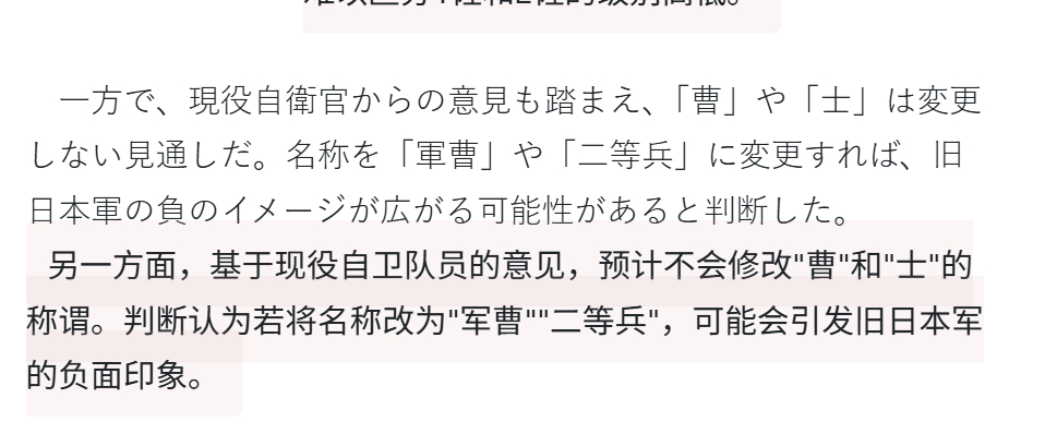 🔻读卖新闻报道:“日本自卫队干部军衔称谓将变更,参谋长改为"大将"、一佐改为"大佐"。基于现役自卫队员的意见,预计不会修改"曹"和"士"的称谓。判断认为若将名称改为"军曹""二等兵",可能会引发对于旧日本军的负面印象。”🔻原来你们知道啊?日本政府拟修改自卫队官阶名称海外新鲜事热点现场