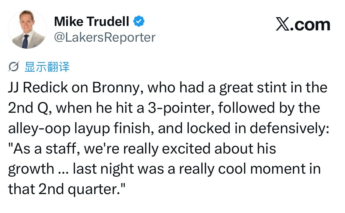雷迪克评价第二节表现亮眼的布朗尼:他命中三分,紧接着完成空接上篮,防守端也专注投入。“教练组所有人,都为他的进步倍感欣喜……昨晚第二节那段时间,是一段非常美好的瞬间。”