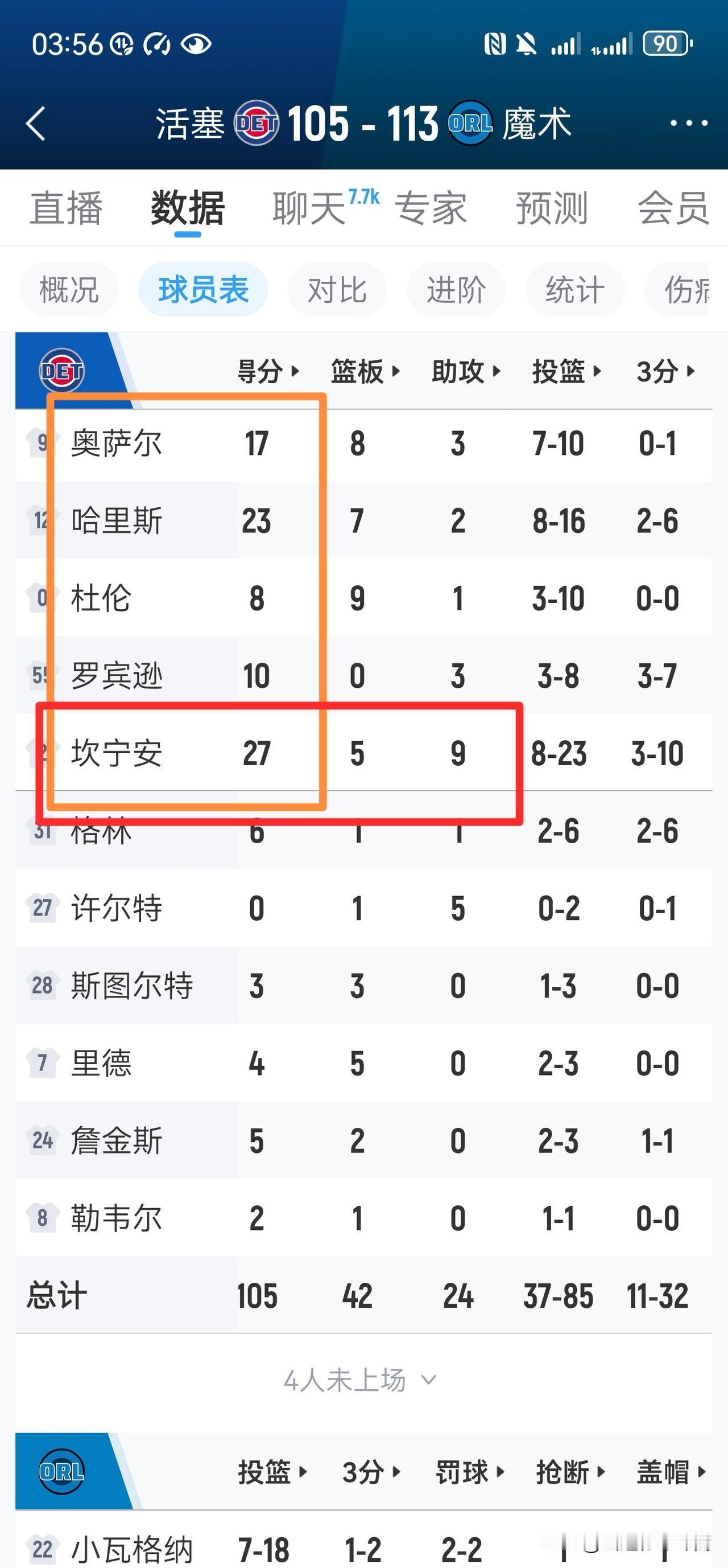 上下两届两大状元对决,没想到班凯罗还能略胜一筹,他本场拿下25分12分9助的准三双,3次失误瑕不掩瑜;坎宁安本场出现多达9次失误,贡献27分5板9助。