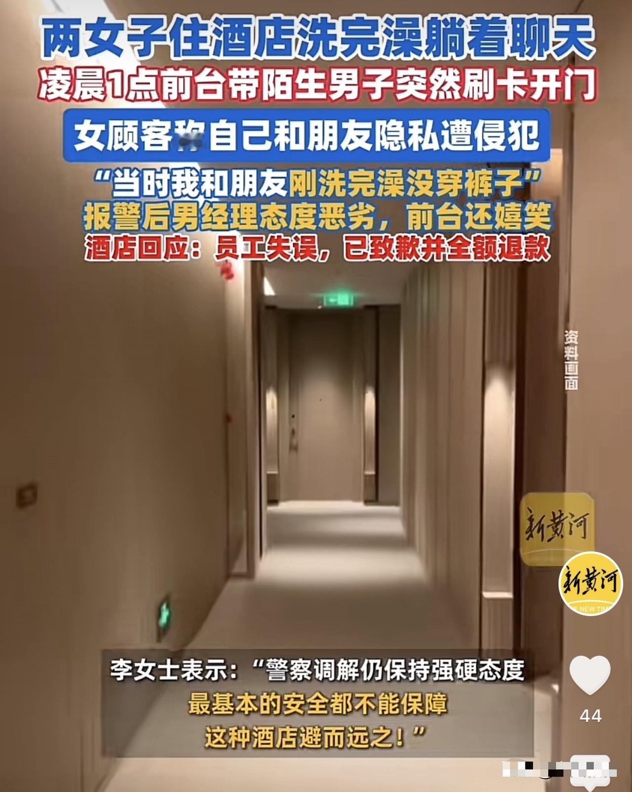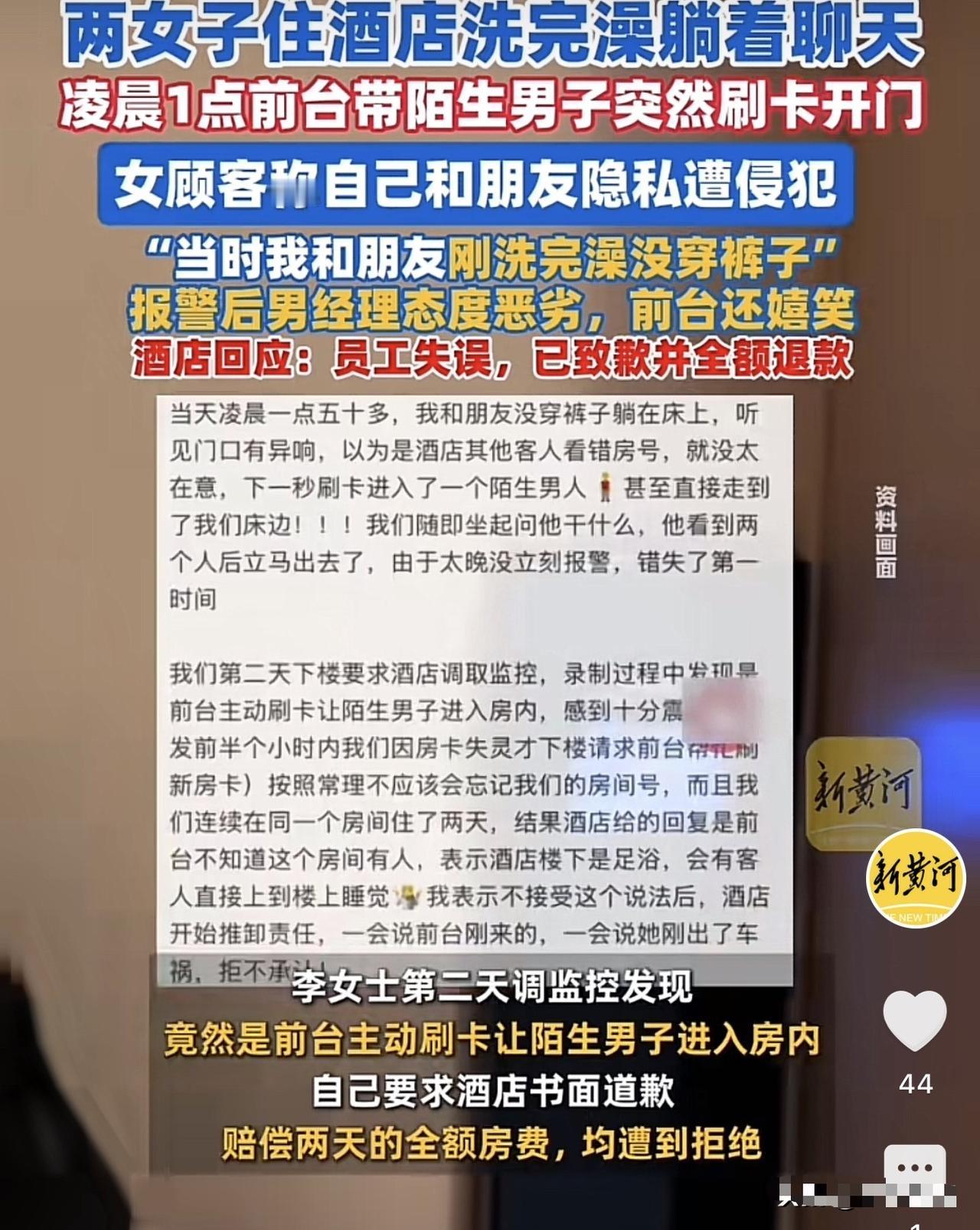 四川德阳,两女子住酒店凌晨快两点,洗完澡没穿裤子锁好门躺在床上聊天,突然陌生男人刷卡推门直冲床边,酒店前台竟主动放人失职曝光。