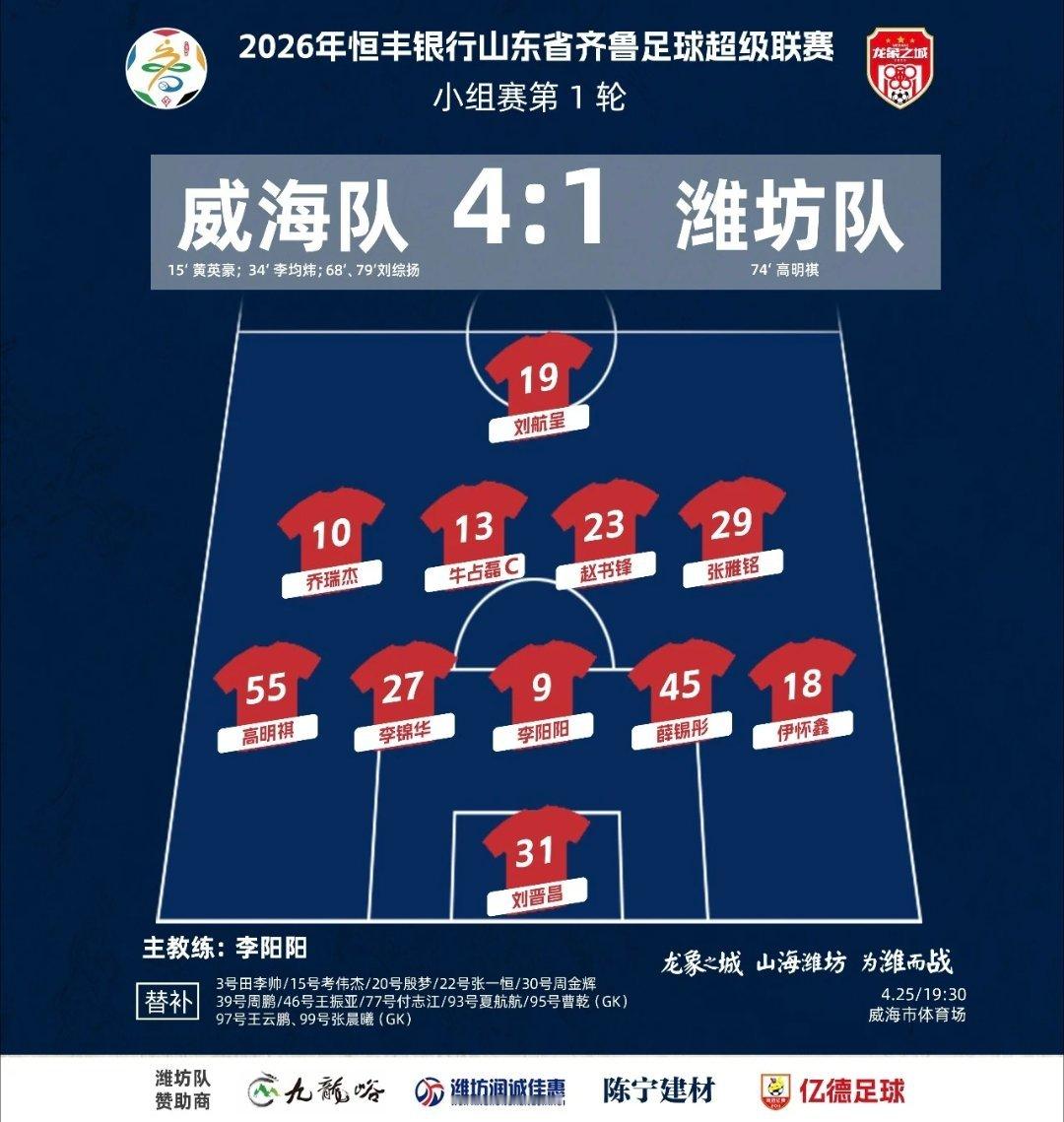 2026齐鲁超赛 第一轮:威海队4:1潍坊队。实力有差距,总结经验,再接再厉,继