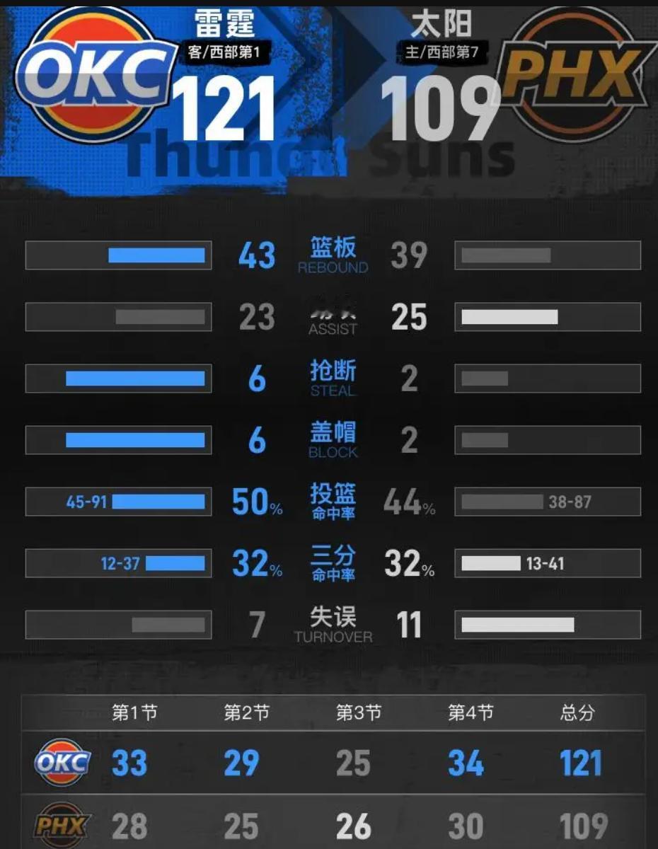 雷霆赢在哪?主心骨硬。亚历山大往前一突,外面卡鲁索、米切尔等着喂饼,霍姆格伦23岁往内线一戳,高度移动全占。太阳呢?追分靠手感,收比赛靠天意。没人从后场把球捋清楚,布克是杀手不是指挥官,格林是终结点不是发牌器。火力再猛,拧不成一股绳,那就是鞭炮,不是炸药包。