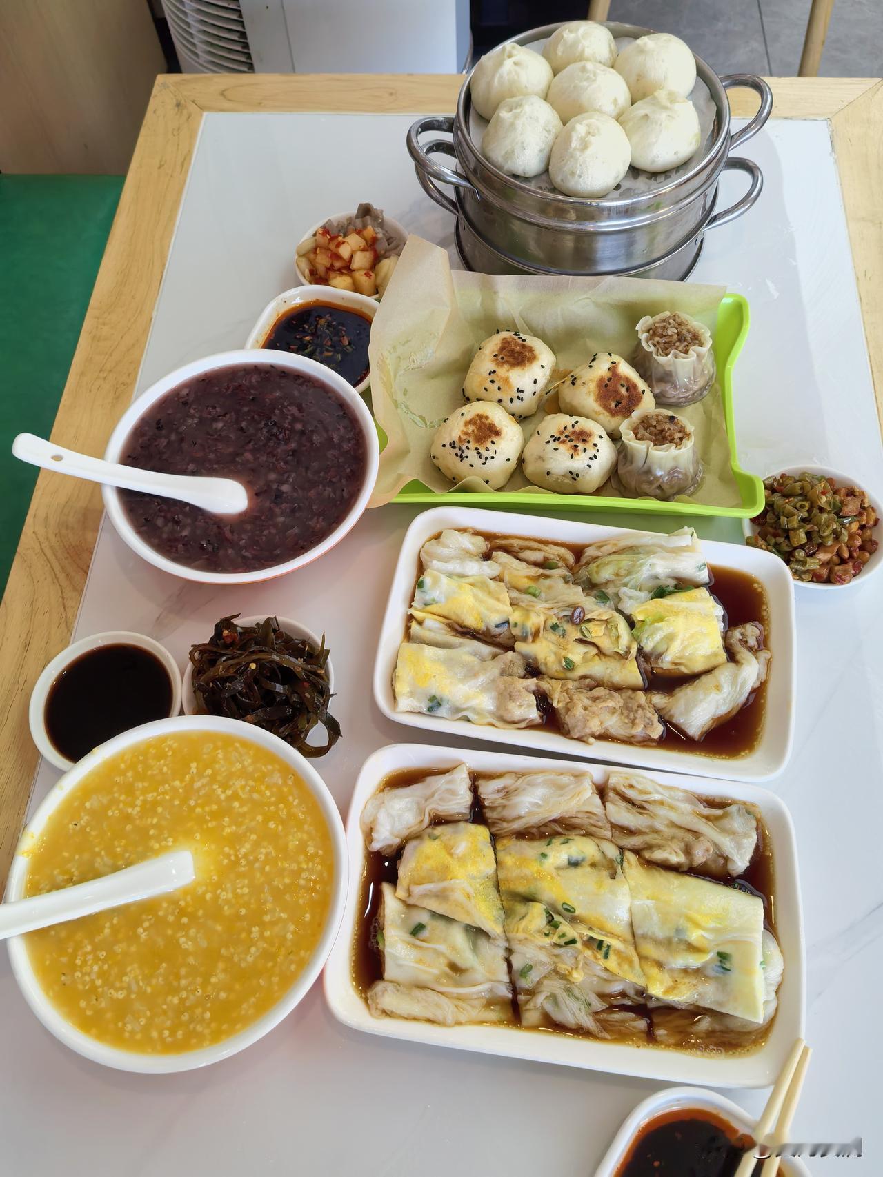 这店品种相当丰富,小笼包、香煎包、油条、南瓜饼、火腿鸡蛋饼等常见美食都有,选择多样,不管你口味如何,都能找到合心意的。店的规模不小,员工分工明确,效率超高。碗筷摆放得整整齐齐,小咸菜也多样干净卫生,看着就很有食欲。